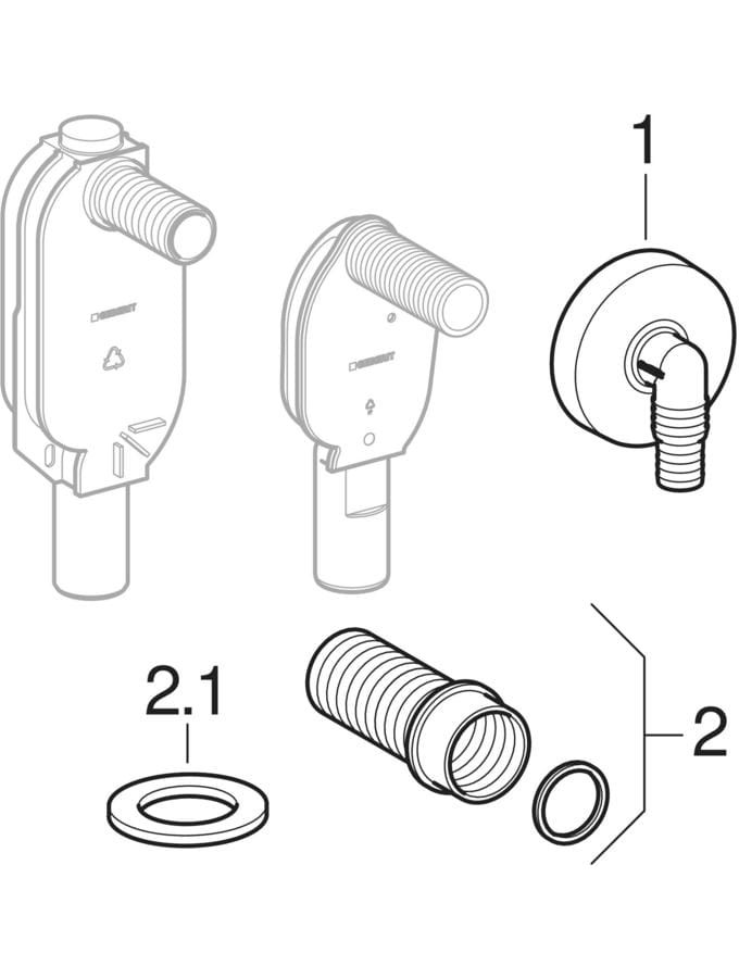zum verdeckten Einbau, zum Anschließen von Waschmaschinen oder Geschirrspüler, güteüberwacht nach EN 274-3, Kunststoff, bestehend aus Winkelschlauchtülle aus PP -Ø 19/23 mm, Wandrosette, Bauschutz und Manschette aus EPDM