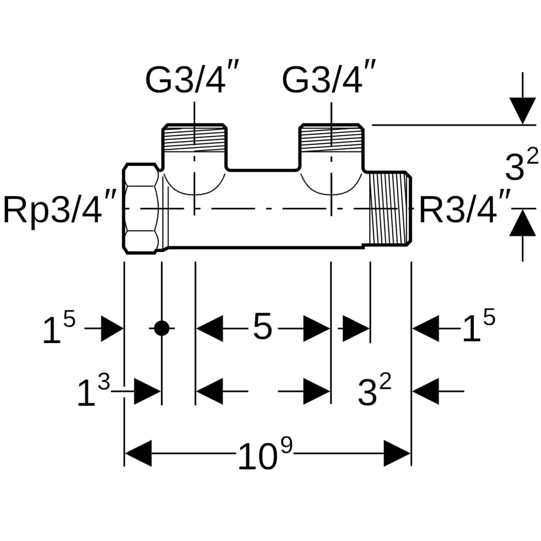 Geberit Verteiler R 3/4 x G 3/4, 2-fach, mit Gewindeanschluss, Rotguss