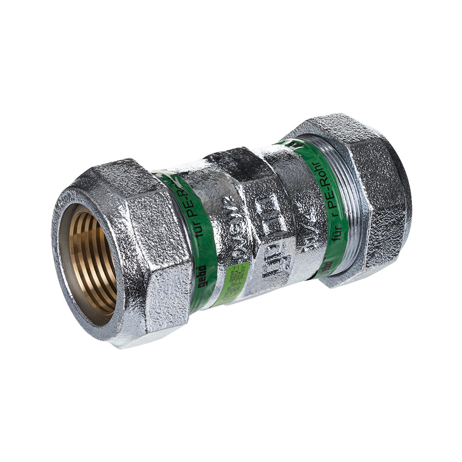 Temperguss-Klemmverschraubung, beidseitig zum Klemmen, reduziert, für PE 80, PE 100, PE-Xa-Rohr (jeweils SDR 11) nach DVGW-Arbeitsblatt GW 335 A2/A3 sowie DIN 8074/75, DIN EN 12201-2 und DIN 16893, 32-63 mm, Medien sind Wasser, Gas (außerhalb von Gebäuden) und Druckluft, Druckstufen bei Wasser (20 °C) PE80 und PE-Xa PN 12,5, PE100 PN 16, bei Gas PE100 PN 10, PE80 PN 4, PE-Xa PN 8 und bei Druckluft: PE80 und PE-Xa PN 10, PE100 PN 12,5, Prüfungen Wasser DIN 8076/DIN EN 10284, DVGW-Reg.-Nr. CW-7511CP0631, Gas DVGW Arbeitsblatt G 5600-1, DVGW-Reg.-Nr.: DG-7521CP0412, der Einsatz von Stützhülsen ist notwendig