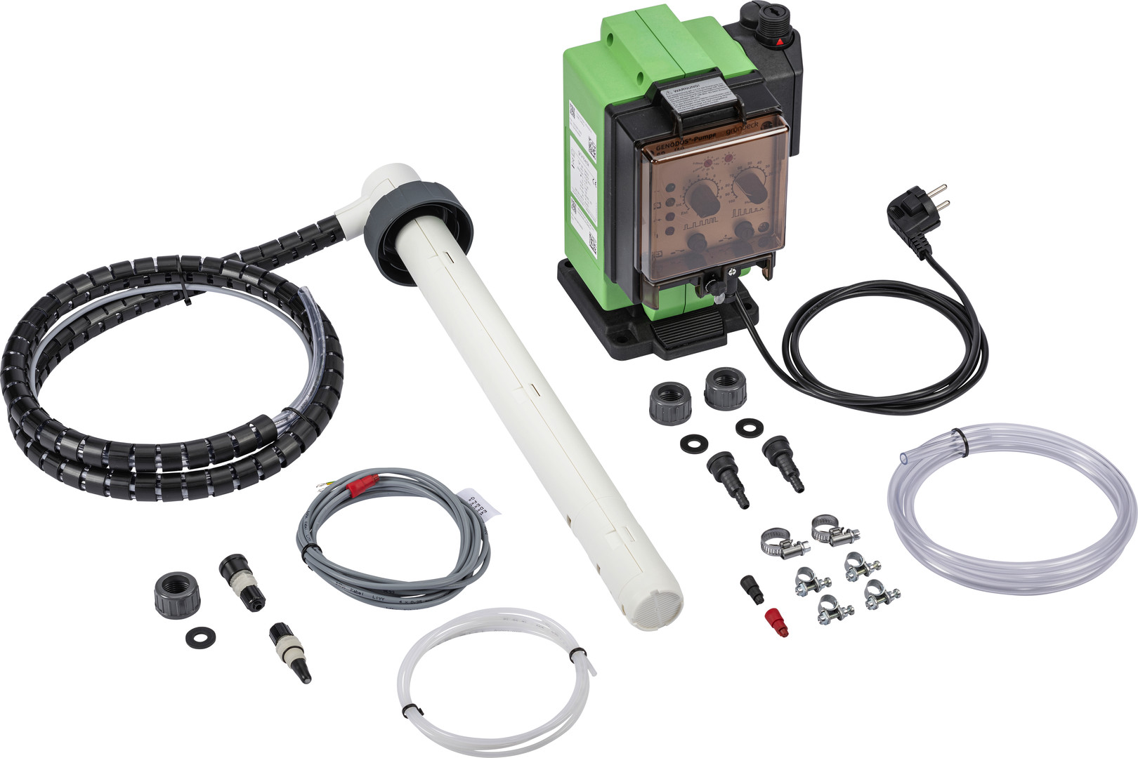 auf die Enthärtungsanlage Delta-p abgestimmt, Elektronik der Dosieranlage empfängt das Dosiersignal über das Impuls-Verbindungskabel und der Steuerung der Enthärtungsanlage Delta-p, bestehend aus: Dosierpumpe Typ GP 2/40 (verplombt) als selbstansaugende und gegen Druck selbstentlüftende Membranpumpe mit Synchronmotor, Befestigungskonsole für Wand-, Boden- oder Behältermontage mit auswechselbarer Elektronikkassette, Anzeigen für Betrieb, Leermeldung, Membranbruch und Dosierüberwachung mit potentialfreier Störmeldung, 1 Impuls-Verbindungskabel für externe Ansteuerung, 1 Sauglanze für 15-L Kanister, 1 Dosierschlauch, 1 Dosierventil, 1 Schlauchanschluss-Set, technische Daten: Impulsfolge (Delta-p): 0,93 l/Impuls, Saughöhe max.: 1,5 m WS, Betriebsdruck max.: 6 bar, Wassertemperatur max.: 30 °C, Stromanschluss: 230 V, 50/60 Hz, Schutzart/Isolationsklasse: IP 54, Pumpe einschließlich 1,7 m Stromanschlusskabel mit Schutzkontaktstecker, Hinweis: Einlegeteil mit Impfstelle ist im Lieferumfang nicht enthalten