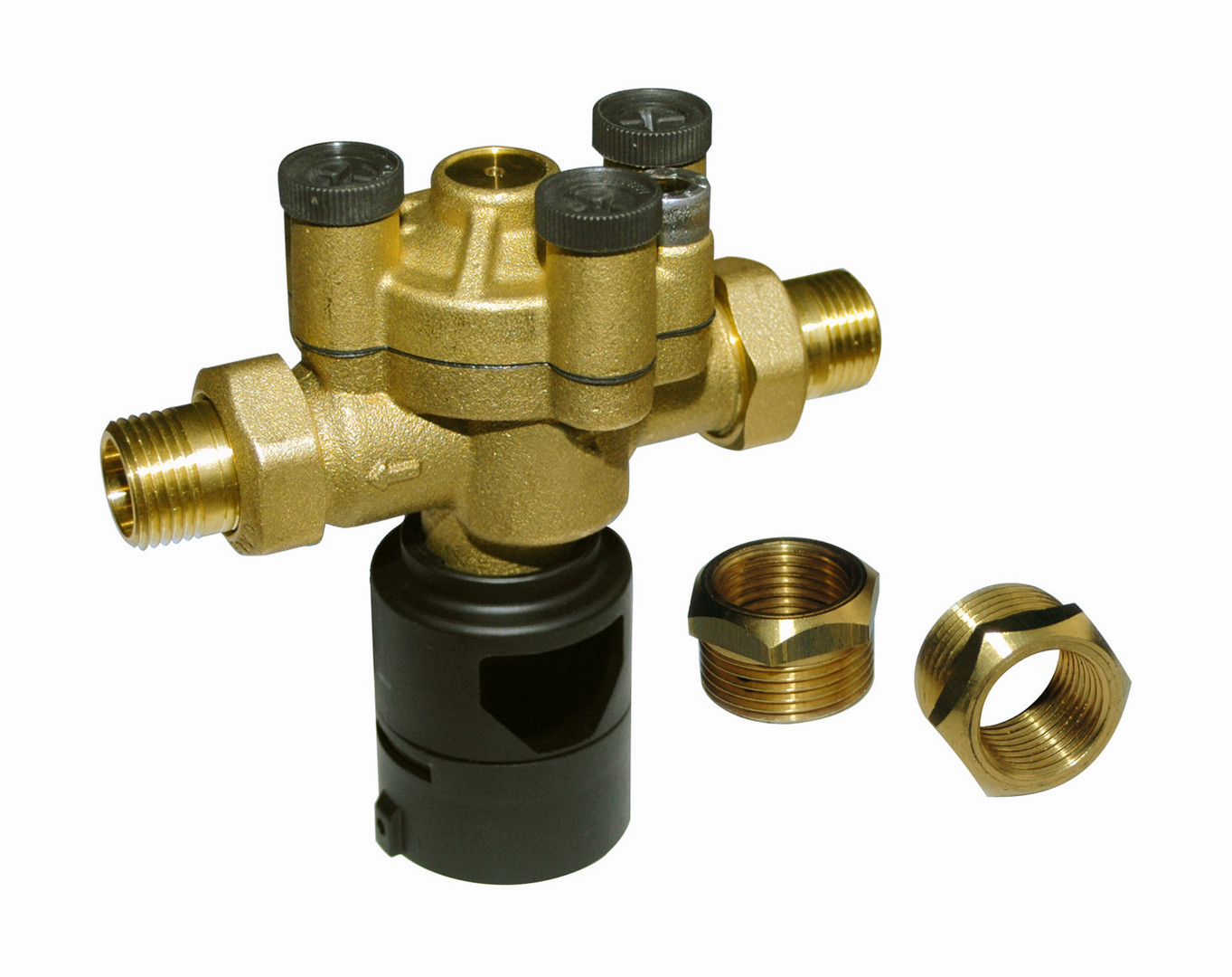 für Betriebstemperatur bis 65 °C bei PN 10, mit Wassereingangs- und Wasserausgangsstutzen, Wasserzählerverschraubungen aus Messing mit Dichtungen und Vorsieb, integrierter Rückflussverhinderer und Tropfwasseranschluss, Reduzierungen 1/2" IG-3/4" AG, drei Anschlussstellen für Prüfmanometer zur Wartung gem. DIN EN 806-5
