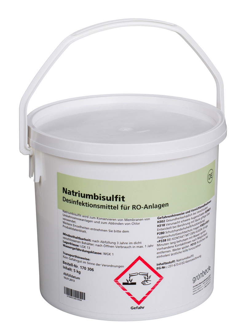 wird in fester Form oder in wässeriger Lösung eingesetzt, in wässriger Lösung hydrolisiert Natriumdisulfit zu Natriumhydrogensulfit, Natriumhydrogensulfit-Lösungen werden verwendet: 1. zum Konservieren von Membranen in Umkehrosmoseanlagen, 2. zum Abbinden von Chlor, wird eine RO-Anlage für mehr als 14 Tage außer Betrieb genommen, ist die Anlage zu konservieren, Konservieren von RO-Anlagen: Die Anleitung zum Ansetzen der Lösung und zur Durchführung der Konservierung ist der Bedienungsanleitung (Spülen/Desinfektion von Membranen in Standard-Umkehrosmoseanlagen) zu entnehmen, Abbinden von Chlor: Zum Abbinden von Chlor wird eine 1-10 %ige Natriumhydrogensulfit-Lösung eingesetzt