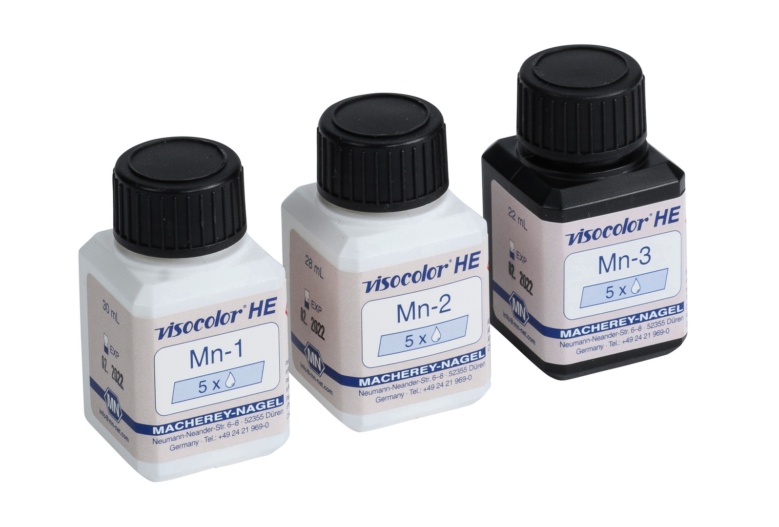 Nachfüllpack Reagenzien zu Wasserprüfeinrichtung Mangan 170097, bestehend aus: 1x Flasche Mangan-1 30 ml, 1x Flasche Mangan-2 28 ml 1x Flasche Mangan-3 22 ml