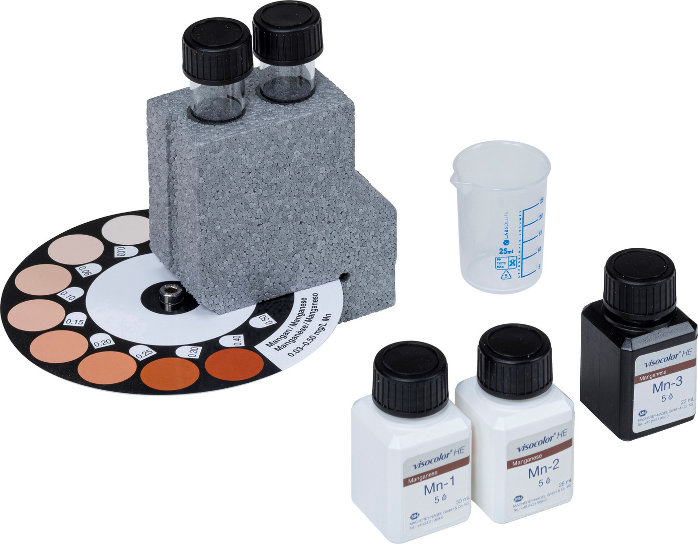 zur quantitativen, kolorimetrischen Bestimmung des Gehaltes an gelöstem Mangan im Messbereich von 0,03-0,5 mg/l, Schnellbestimmungssatz bestehend aus: 1x Komparatorblock, 1x Farbscheibe Mangan, 2x Rundgläser mit Schraubverschluss, 1x Kunststoffbecher zur Probenahme, 1x Flasche Mangan-1, 30 ml, 1x Flasche Mangan-2, 28 ml, 1x Flasche Mangan-3, 22 ml, 100 Bestimmungen