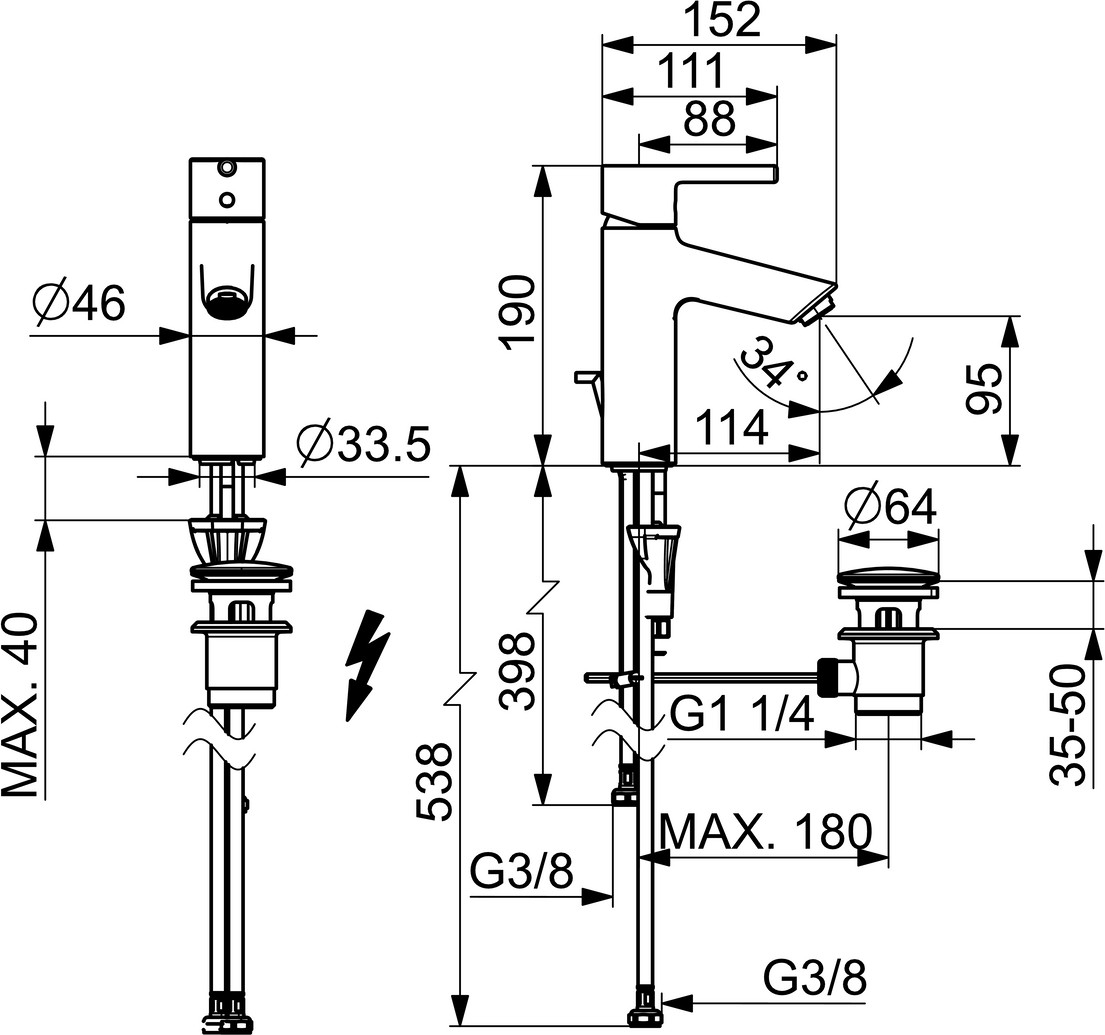 Armaturenkörper aus entzinkungsbeständigem Messing (DZR), 3S-Installation System für sichere und schnelle Montage, Heißwasserversorgung max. +70 °C, Einhandbedienhebel/Griff, mit W+K-Kennzeichnung, Temperaturbegrenzer, Ablaufgarnitur mit Zugstange, Anschluss über flexible Druckschläuche (G 3/8), Sicherungseinrichtung (EN 1717) AA, Ø 3.0 Steuerpatrone mit keramischen Dichtscheiben zur Wassermengen- und Temperatureinstellung, feststehender Auslauf, Strahlreglertyp CASCADE Strahlregler, Kristallklarer Laminarstrahl