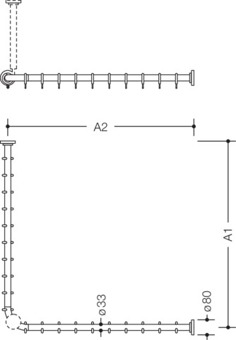Vorhangstange auf Maß gefertigt, suizidhemmende Ausführung, waagerecht angeordnete, im rechten Winkel verbundene Stangen mit Vorhangringen und magnetischen Befestigungsrosetten, Stangen lösen sich bei einer Belastung von ca. 25 kg (wiederverwendbar), mit Metallkern, kann bauseits an den Rosettenseiten bis auf 220 mm gekürzt werden, Stangen ø 33 mm, Rosetten ø 80 mm, aus hochwertigem Polyamid, mit Vorbereitung für Deckenabhängung im Bogen, Deckenabhängung suizidhemmende Ausführung erforderlich