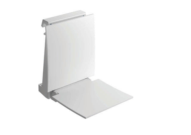 Einhängevorrichtung aus Metall, weiß pulverbeschichtet, Sitzfläche und Rückenlehne aus glasfaserverstärktem Polyamid, rutschhemmende, strukturierte Sitzoberfläche, Sitzfläche kann hochgeklappt werden, keine Verstrebungen/Befestigungen im hochgeklappten Zustand sichtbar, Tragegriff kann bei Nichtgebrauch versenkt werden und dient gleichzeitig als Kippsicherung, zum Einhängen in Duschhandläufe und Haltegriffe ø 33 mm, maximale Belastbarkeit 150 kg