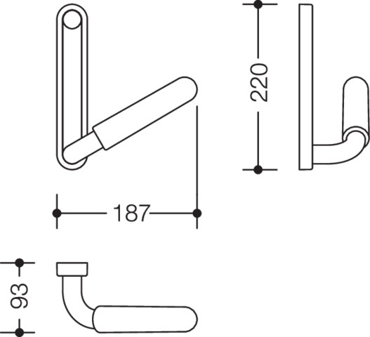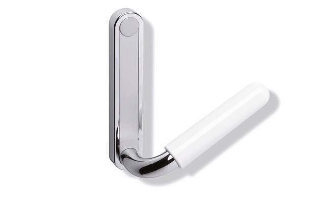 mit Kunststoff Griffstück mit Schildmontage, Position der Haltegriffe bei Auslieferung 30°, vor Montage verstellbar, mit korrosionsfreiem Befestigungsmaterial, 187 x 220 x 93 mm Schild und Griff aus verchromtem Aluminium mit pulverbeschichteten matt-silbernen Designelementen, Griffstück aus Polyamid
