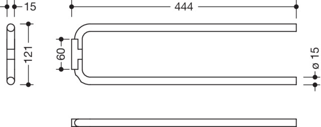 mit zwei übereinander angeordneten, zylindrischen Haltearmen, die Haltearme können einzeln seitlich geschwenkt werden, aus hochwertigem Edelstahl, 444 mm lang, 121 mm hoch, Haltearme ø 15 mm, zur Wandmontage, verdeckte Befestigung, mit korrosionsfreiem Befestigungsmaterial