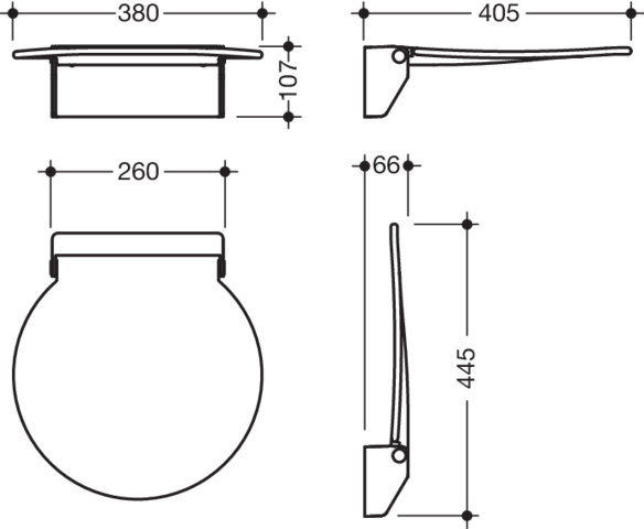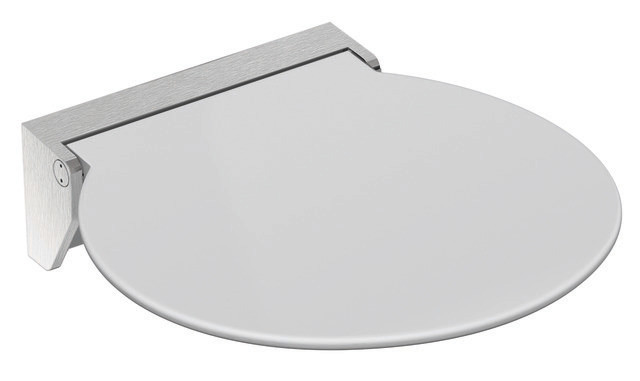 Konstruktion aus Wandkonsole und durchgehender Sitzfläche, Sitzfläche belastbar bis 150 kg, Sitzfläche kann hochgeklappt werden, Sitztiefe in hochgeklapptem Zustand 66 mm, keine Verstrebungen und Befestigungen in hochgeklapptem Zustand sichtbar, mit Rückenlehne 950.51.02090 kombinierbar, Sitzfläche aus glasfaserverstärktem Polyamid, Wandkonsole aus Edelstahl, zum flexiblen Nachrüsten auf bestehende, vormontierter Montageplatte: 950.51.014 (separat zu bestellen), mobil einsetzbar, werkzeuglose Montage durch Einhängen des Sitzes, gegen unbeabsichtigtes Herausziehen mit Rändelschraube gesichert