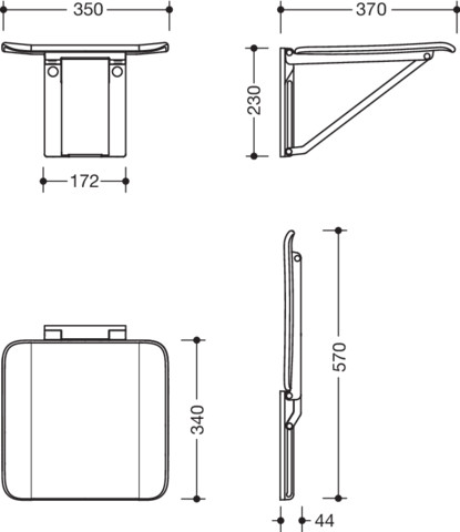 Konstruktion aus Wandkonsole, Bügel, Sitzkonsole und Sitzfläche, rutschhemmende, strukturierte Sitzfläche aus Kunststoff in den Farben 98 (Signalweiß) und 90 (Tiefschwarz), Wandkonsole und Bügel aus hochwertigem Kunststoff in den Farben 98 (Signalweiß) und 90 (Tiefschwarz), passend zur Sitzfläche, zusätzliche Wandabstützung ermöglicht erhöhte Beinfreiheit, da keine Bodenstütze notwendig ist die leicht gebogene Form der Sitzfläche definiert die Sitzposition und gibt angenehmen Halt, Sitzfläche kann platzsparend hochgeklappt werden, Sitztiefe im hochgeklappten Zustand 44 mm, wartungsfreies, dauerhaft leichtgängiges Gelenk, belastbar bis 150 kg, 350 mm breit, 370 mm tief und 230 mm hoch, Sitzfläche 350 mm breit und 340 mm tief, zur Montage mit korrosionsfreiem und geprüftem Befestigungsmaterial für unterschiedliche Wandaufbauten (separat zu bestellen), Dichtband zur Abdichtung der Befestigungspunkte ist im Lieferumfang enthalten
