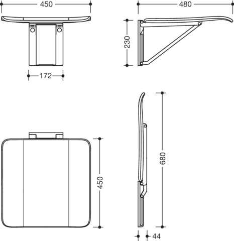Konstruktion aus Wandkonsole, Bügel, Sitzkonsole und Sitzfläche, rutschhemmende, strukturierte Sitzfläche aus Kunststoff in den Farben 98 (Signalweiß) und 90 (Tiefschwarz), Wandkonsole und Bügel aus hochwertigem Kunststoff in den Farben 98 (Signalweiß) und 90 (Tiefschwarz), passend zur Sitzfläche, zusätzliche Wandabstützung ermöglicht erhöhte Beinfreiheit da keine Bodenstütze notwendig ist, die leicht gebogene Form der Sitzfläche definiert die Sitzposition und gibt angenehmen Halt, Sitzfläche kann platzsparend hochgeklappt werden, Sitztiefe im hochgeklappten Zustand 44 mm, wartungsfreies, dauerhaft leichtgängiges Gelenk, belastbar bis 150 kg, 450 mm breit, 480 mm tief und 230 mm hoch, Sitzfläche 450 mm breit und 450 mm tief, zur Montage mit korrosionsfreiem und geprüftem Befestigungsmaterial für unterschiedliche Wandaufbauten (separat zu bestellen), Dichtband zur Abdichtung der Befestigungspunkte ist im Lieferumfang enthalten, erfüllt die Anforderungen nach DIN 18040, ÖNORM B1600/1601 und SIA 500