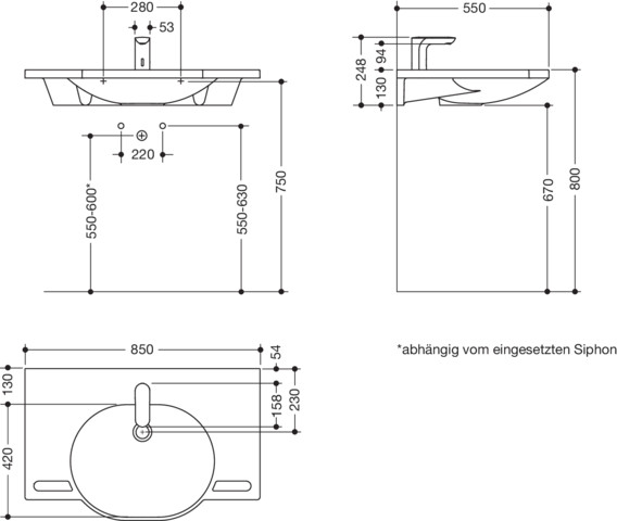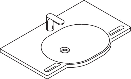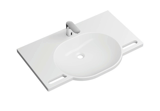 mit Ablagefläche und ovalem Becken, ohne Überlauf, mit porenfreier Oberfläche, integrierte Haltemöglichkeit, als Handtuchhalter nutzbar, unterfahrbar nach DIN 18040 und ÖNORM B 1600/1601, belastbar nach DIN EN 14688, für Stockschraubenbefestigung