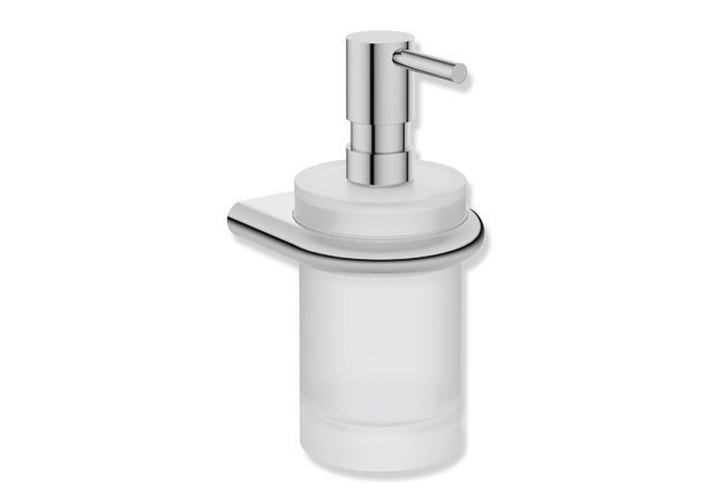 zur Aufnahme handelsüblicher Flüssigseife, Desinfektionsmittel und -gele, ringförmiger Wandhalter aus hochwertigem Edelstahl, mit Schutzring aus Kunststoff für eine sichere, definierte Position und gegen Beschädigung des Glaseinsatzes, Seifenspender aus hochwertigem, satiniertem Kristallglas, Füllmenge ca. 200 ml, zur Wandmontage, verdeckte Befestigung, 85 mm breit, 168 mm hoch und 92 mm tief, mit korrosionsfreiem HEWI Befestigungsmaterial
