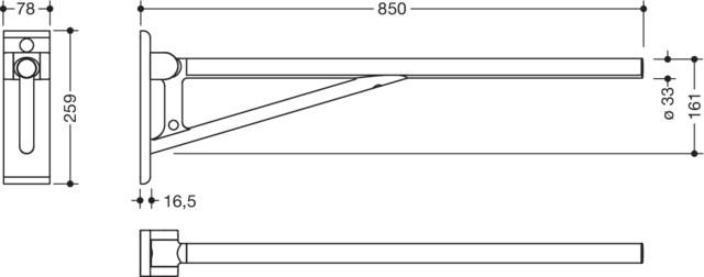 mit einer waagerechten, runden Griffebene, kann nach oben und gebremst nach unten geklappt werden, dauerhaft leichtgängiges,wartungsarmes Gelenk, voreingestellt ab Werk, 259 mm hoch und 78 mm breit, Holm ø 33 mm, belastbar bis 100 kg, Wandplatte und Ausleger aus hochwertigem Kunststoff, Holm aus Metall, pulverbeschichtet in den Farben CV (Schwarz tiefmatt) in Verbindung mit schwarzem Ausleger und Wandplatte und AS (Weiß tiefmatt) in Verbindung mit weißem Ausleger und Wandplatte, für Montage mit korrosionsfreiem und geprüftem Befestigungsmaterial für unterschiedliche Wandaufbauten (separat zu bestellen), Dichtband zur Abdichtung der Befestigungspunkte ist im Lieferumfang enthalten