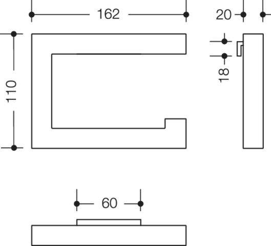 u-förmiger, nach rechts geöffneter WC-Papierhalter aus einem Vierkantprofil, zur Wandmontage, verdeckte Befestigung, Vierkant 20 mm, aus Metall, mit korrosionsfreiem Befestigungsmaterial