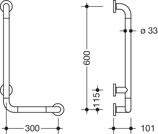 erhöhter WandabstandGreifen, mit durchgehendem, korrosionsgeschütztem Stahlkern, links- und rechtsseitig montierbar, Montage an der Wand mit Befestigungsmaterial von HEWI, bei der Montage an Leichtbauwänden ist eine Hinterfütterung aus Schichtholzplatten mit mind. 20 mm Dicke erforderlich, waagerechte Länge 300 mm, senkrechte Länge 600 mm, 101 mm tief, Stange ø 33 mm, Rosetten ø 70 mm, aus Polyamid