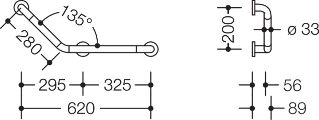 aus chromoptisch beschichtetem Polyamid, mit durchgehendem, korrosionsgeschütztem Stahlkern und Stahl-Befestigungsrosetten, links- und rechtsseitig montierbar, Montage an der Wand mit wandspezifischem Befestigungsmaterial und Rosetten, erhöhte Stabilität durch 3. Befestigungsstütze, 89 mm tief, lichter Abstand zur Wand 56 mm, Achsmaße 325 mm, 295 mm, 200 mm, Winkel 135 mm,Stangen 33 mm, Rosetten 70 mm, Aufrüstsatz WC-Papierhalter 801.50.010, 801.50.011 und Aufrüstsatz WC-Spülauslösung (Funk) 801.50.060 nachrüstbar