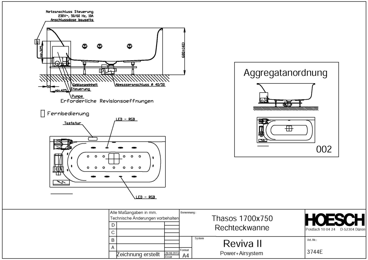 HO Whirlwanne Thasos Rechteck 1700x750 mit System Reviva II Power+Air Weiß/Chrom/Motor links