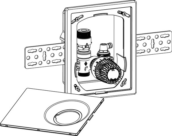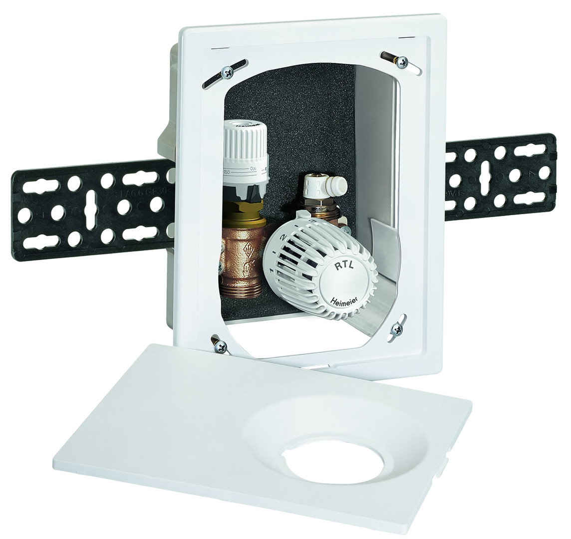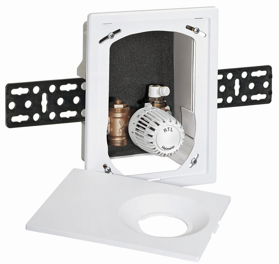 Unterputz-Einzelraumtemperaturregelung für Fußbodenheizung, mit automatischer Durchflussregelung, Abdeckung mit verdeckter Schraubbefestigung, flexible Montage für alle Wandarten, 30 mm Tiefenausgleich, Maximalbegrenzung der Rücklauftemperatur, Absperrung und Entlüftung, für Fußbodenheizungen, Wandheizungen, kombinierte Fußboden-Radiatorheizungsanlagen, Gehäuse DN 15, die Bautiefe des UP-Kasten beträgt 60 mm, flexibler Einbau durch variablen Abstand zwischen UP-Kasten und Abdeckung von bis zu 30 mm, die Abdeckung kann einen schrägen Einbau des UP-Kasten bis zu 6° je Seite ausgleichen, Nenndruck PN 10, Einstellbereich Rücklauftemperaturbegrenzer RTL 0-50 °C, max. Betriebstemperatur 90 °C, min. Betriebstemperatur 2 °C, es ist für alle Multibox-Ausführungen zu berücksichtigen, dass die von der Anlage gefahrene Vorlauftemperatur für den Systemaufbau der Fußbodenheizung geeignet ist, der Durchfluss kann innerhalb des angegebenen Bereiches stufenlos eingestellt werden 10-150 l/h, Werkseinstellung 150 l/h, max. Differenzdruck 60 kPa, min. Differenzdruck 10-100 l/h=10 kPa, 100-150 l/h=15 kPa, Ventilgehäuse korrosionsbeständiger Rotguss, Niro-Stahlspindel mit doppelter O-Ring-Abdichtung, der äußere O-Ring ist unter Druck auswechselbar, Kunststoffelemente aus ABS und PA, Fühlerelemente Rücklauftemperaturbegrenzer (RTL) mit dehnstoffgefülltem Thermostat, Oberflächenbehandlung Abdeckung und Skalenhaube in weiß RAL 9016, Durchflussrichtungspfeile, Anschluss G 3/4 mit Konus passend für Klemmverschraubungen für Kunststoff-, Kupfer-, Präzisionsstahl- und Verbundrohr