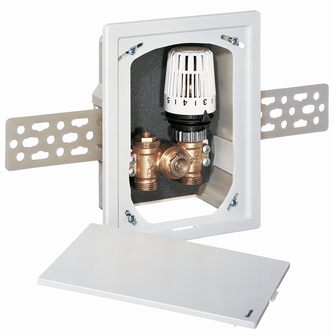 Unterputz-Einzelraumregelung mit geschlossener Abdeckplatte, Maximalbegrenzung der Rücklauftemperatur, Voreinstellung, Absperrung und Entlüftung, für Fußbodenheizungen, Wandheizungen, kombinierte Fußboden-Radiatorheizungsanlagen, Gehäuse DN 15, die Bautiefe des UP-Kasten beträgt 60 mm, flexibler Einbau durch variablen Abstand zwischen UP-Kasten und Abdeckung von bis zu 30 mm, die Abdeckung kann einen schrägen Einbau des UP-Kasten bis zu 6° je Seite ausgleichen, Nenndruck PN 10, Rücklauftemperaturbegrenzer RTL 0-50 °C, max. Betriebstemperatur 90 °C, min. Betriebstemperatur 2 °C, es ist für alle Multibox-Ausführungen zu berücksichtigen, dass die von der Anlage gefahrene Vorlauftemperatur für den Systemaufbau der Fußbodenheizung geeignet ist, Ventilgehäuse korrosionsbeständiger Rotguss, Niro-Stahlspindel mit doppelter O-Ring-Abdichtung, der äußere O-Ring ist unter Druck auswechselbar, Kunststoffelemente aus ABS und PA, Rücklauftemperaturbegrenzer (RTL) mit dehnstoffgefülltem Thermostat, Abdeckung in weiß RAL 9016, Durchflussrichtungspfeile, Anschluss G 3/4 mit Konus passend für Klemmverschraubungen für Kunststoff-, Kupfer-, Präzisionsstahl- und Verbundrohr