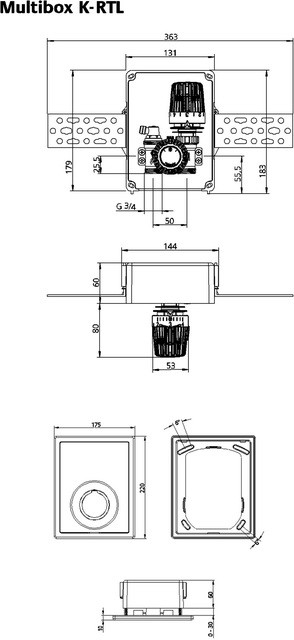 wird für die dezentrale Regelung von Fußbodenheizungen eingesetzt, Einzelraumtemperaturregelung, Maximalbegrenzung der Rücklauftemperatur, Voreinstellung (V-exact II), Absperrung und Entlüftung, für Fußbodenheizungen, Wandheizungen, kombinierte Fußboden- Radiatorheizungsanlagen, Gehäuse DN 15, die Bautiefe des UP-Kasten beträgt 60 mm, flexibler Einbau durch variablen Abstand zwischen UP-Kasten und Abdeckung von bis zu 30 mm, die Abdeckung kann einen schrägen Einbau des UP-Kasten bis zu 6° je Seite ausgleichen, Nenndruck PN 10, Thermostat-Kopf K 6-28 °C, Rücklauftemperaturbegrenzer RTL 0-50 °C, max. Betriebstemperatur 90 °C, min. Betriebstemperatur 2 °C, es ist für alle Multibox-Ausführungen zu berücksichtigen, dass die von der Anlage gefahrene Vorlauftemperatur für den Systemaufbau der Fußbodenheizung geeignet ist, Ventilgehäuse korrosionsbeständiger Rotguss, Niro-Stahlspindel mit doppelter O-Ring-Abdichtung, der äußere O-Ring ist unter Druck auswechselbar, Kunststoffelemente aus ABS und PA, Thermostat-Kopf K mit flüssigkeitsgefülltem Thermostat, Rücklauftemperaturbegrenzer (RTL) mit dehnstoffgefülltem Thermostat, alle Ausführungen wahlweise mit Abdeckung und sichtbarer Skalenhaube in weiß RAL 9016 oder verchromt, Durchflussrichtungspfeile, Anschluss G 3/4 mit Konus passend für Klemmverschraubungen für Kunststoff-, Kupfer-, Präzisionsstahl- und Verbundrohr