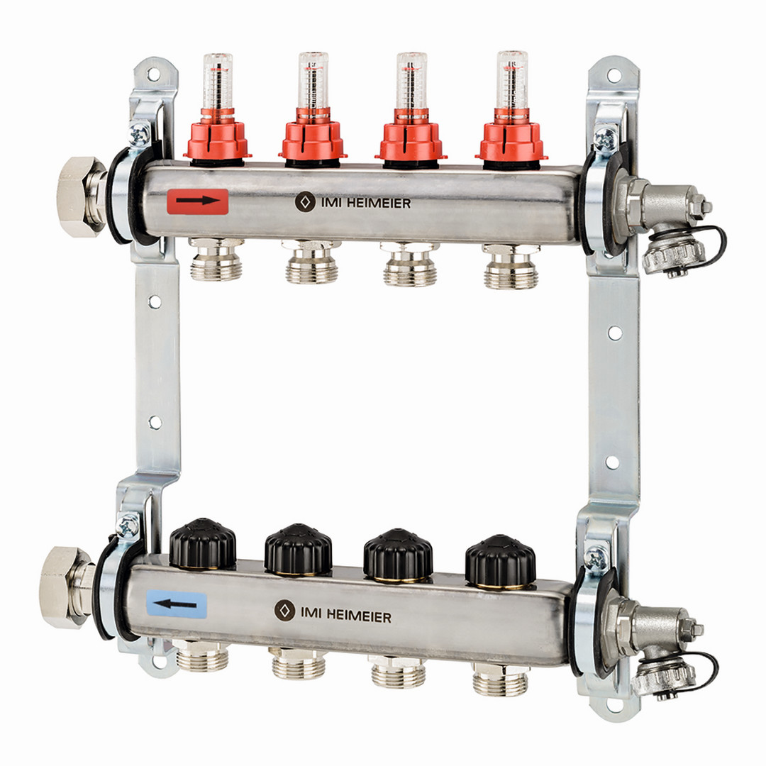 mit Durchflussmengenanzeiger, der Durchfluss der einzelnen Heizkreise wird direkt in l/min. eingestellt, dadurch ist der hydraulische Abgleich in wenigen Schritten erledigt, Funktion: Einzelraumtemperaturregelung mit Stellantrieb oder Thermostat-Kopf, Durchflusseinstellung, Absperren, Füllen, Entleeren, Spülen, Entlüften, max. Betriebstemperatur 60 °C, min. Betriebstemperatur -5 °C, der Durchfluss kann innerhalb des angegebenen Bereiches stufenlos eingestellt werden 0-5 l/min, PN 6, Verteiler aus Edelstahl, Anschlussverschraubungen Messing, vernickelt, Niro-Stahlspindel mit doppelter O-Ring-Abdichtung, der äußere O-Ring ist unter Druck auswechselbar, Verteiler mit flachdichtender Anschluss, Überwurfmutter 1", Füll-, Entleer-, Spül- und Entlüftungsvorrichtung: Messing, vernickelt und Kunststoff, Dichtungen aus EPDM, Rohranschlüsse 3/4" Eurokonus, passend für Klemmverschraubungen, für Kunstsoff-, Kupfer-, Präzisionsstahl- und Verbundrohr, Durchflussanzeiger: wärmebeständige Kunststoffe und rostfreier Stahl, Dichtungen aus EPDM, Anschlussset 1 mit 2 Globo Kugelhähnen, Anschlussset 2 mit STAD Einregulierungsventil und Globo Kugelhahn, Anschlussset 3 mit Luftabscheider Zeparo Vent im Vorlauf und Schlammabscheider Zeparo Dirt im Rücklauf, Anschlussset 4 mit Globo Kugelhahn mit Distanzstück für Wärmemengenzähler im Rücklauf und Globo Kugelhahn mit Anschluss für Direktmessung im Vorlauf und Rücklauf, Anschlussset 5 Festwertregelstation mit Hocheffizienzpumpe zur Regelung der Vorlauftemperatur
