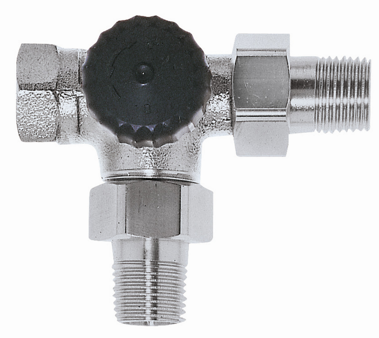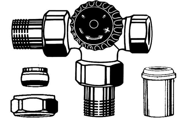 Thermostat-Dreiwege-Ventilunterteil ohne Voreinstellung, mit automatischer Bypass-Steuerung, die Thermostat-Dreiwege-Ventilunterteile werden in Zweirohr-Pumpenheizungsanlagen eingesetzt, für den Einsatz in Einrohr-Pumpenheizungsanlagen ist ein Umrüst-Thermostat-Oberteil erhältlich, bei gleichzeitigem Schließen fast aller Ventile bauen sich zusätzliche Drücke in der Heizungsanlage auf, sperrt das Dreiwegeventil den Heizkörpervorlauf ab, wird der Bypass zum Rücklauf voll geöffnet, zusätzliche Drücke werden vermieden und der Druck annähernd konstant gehalten, der Bypass kann mit dem entsprechenden Bypass T-Stück am Heizkörper-Rücklauf angeschlossen werden, Zweirohr- oder Einrohr Pumpenheizungsanlagen, Funktionen Regeln, Absperren, Vermeidung von zusätzlichem Differenzdruck, Sicherstellung von Mindestumlaufwassermengen, DN 15, PN 10, max. Betriebstemperatur 120 °C, mit Bauschutzkappe oder Stellantrieb 100 °C, min. Betriebstemperatur -10 °C, Ventilgehäuse korrosionsbeständiger Rotguss, Bypass T-Stück: Messing, Thermostat-Oberteil Messing, Spindel Niro-Stahlspindel mit doppelter O-Ring-Abdichtung, der äußere O-Ring ist unter Druck auswechselbar, Oberflächenbehandlung Ventilgehäuse und Anschlussverschraubung vernickelt, Bauschutzkappe schwarz, das Gehäuse des Ventilunterteiles bzw. des Bypass T-Stückes ist ausgelegt für den Anschluss an Gewinderohr, oder in Verbindung mit Klemmverschraubungen an Kupfer- Präzisionsstahl- oder Verbundrohr, Bypassanschluss mit DN 15 Klemmverschraubung, DN 15 (1/2") Schraubnippel, SW1 27 mm, SW2 30 mm