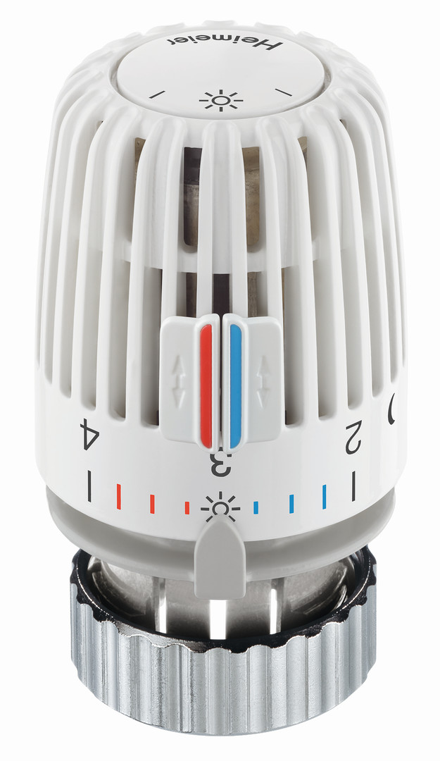 mit Direktanschluss an Fremdfabrikate, eingebauten Fühler, für Baureihe ab 1987, die Klemmverbindung mit Rändelmutter ermöglicht einen direkten Anschluss an Thermostat-Oberteile, die nicht über das Anschlussgewinde M30x1,5 verfügen, Raumtemperaturregelung, Frostschutzsicherung, obere und untere Begrenzung bzw. Markierung des Temperaturbereiches oder Blockierung einer Einstellung durch zwei Sparclips, verdeckte obere und untere Begrenzung des Temperaturbereiches oder Blockierung einer Einstellung durch Anschlagclips, Proportional-Regler ohne Hilfsenergie, flüssigkeitsgefüllter Thermostat, hohe Stellkraft, geringste Hysterese, optimale Schließzeit, stabiles Regelverhalten auch bei kleinen Auslegungsregeldifferenzen (<1 K), entspricht EnEV bzw. DIN 4701-10, Temperatureinstellbereich 6-28 °C, max. Fühlertemperatur 50 °C, spezifische Ausdehnung 0,22 mm/K, Überhubsicherung, weiß RAL 9016, Merkzahlen 1-5, Symbole für Grundeinstellung und Nachtabsenkung, stirnseitige Einstellhilfe und erfühlbare Markierungen für Handicap, Drehrichtungsanzeige, der Thermostat-Kopf kann in mehrere, jeweils um 90° versetzte Positionen montiert werden