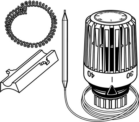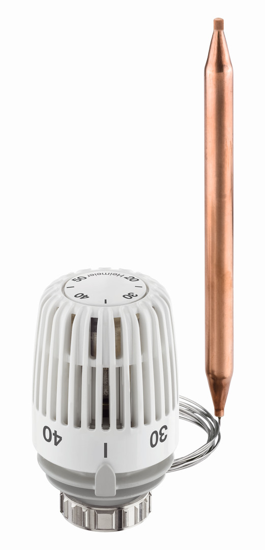 mit Anlege- oder Tauchfühler, für die Mediumtemperaturregelung mit Thermostat-Ventilunterteilen und Dreiwegeventilen in Heizungs- und Kühlanlagen, flüssigkeitsgefüllter Thermostat, Wärmeleitsockel aus Aluminium, verdeckte obere und untere Begrenzung des Temperaturbereiches oder Blockierung einer Einstellung durch Anschlagclips, Proportional-Regler ohne Hilfsenergie, hohe Stellkraft, geringste Hysterese, optimale Schließzeit, Temperatureinstellbereich 20-50 °C, Kapillarrohrlänge 2 m, max. Fühlertemperatur 60 °C, spezifische Ausdehnung 0,17 mm/K, Überhubsicherung, weiß RAL 9016