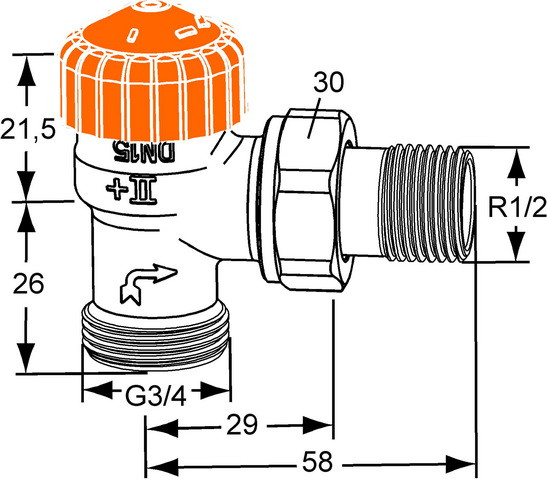 mit automatischer Durchflussregelung auf den eingestellten Wert, Absperren, KEYMARK-zertifiziert, geprüft nach DIN EN 215, Temperaturregelung, Dimensionen DN 10-20, Nenndruck PN 10, Gehäuse aus korrosionsbeständigem Rotguss, Ventilgehäuse und Anschlussverschraubung vernickelt, mit Niro-Stahlspindel und doppelter O-Ring-Abdichtung, der Durchfluss ist von 10 bis 150 l/h stufenlos einstellbar, der eingestellte Durchfluss wird nicht überschritten, das Ventil regelt den Durchfluss unabhängig vom Differenzdruck, das komplette Thermostat-Oberteil kann mit dem Montagegerät ohne Entleeren der Anlage ausgewechselt werden, Anschluss Innengewinde für Gewinderohr, oder in Verbindung mit Klemmverschraubungen an Kupfer-, Präzisionsstahl- oder Verbundrohr (nur DN 15), max. Betriebstemperatur 120 °C, mit Bauschutzkappe oder Stellantrieb 100 °C, min. Betriebstemperatur -10 °C, min. Differenzdruck 10-100 l/h: 10 kPa, 100-150 l/h: 15 kPa, max. Differenzdruck 60 kPa, Inbetriebnahme-Stellung max. Nenndurchfluss qmN bei 10 kPa nach EN 215: 110 l/h, DN 15, SW1 27 mm, SW2 30 mm, Maß H1 21,5 mm bei Auflagefläche Thermostat-Kopf oder Stellantrieb