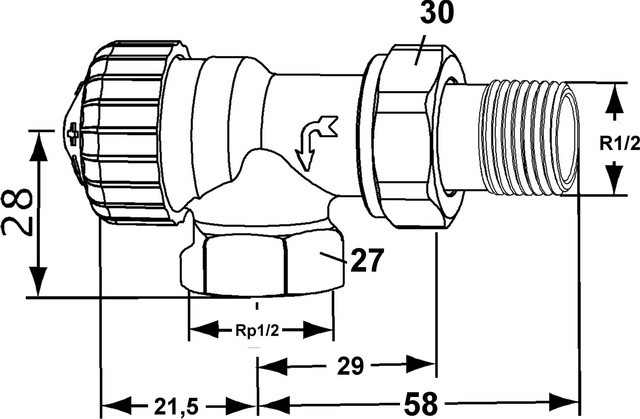 Thermostat-Ventilunterteile für umgekehrte Flussrichtung mit und ohne Voreinstellung zum Einsatz in Zweirohr-Pumpenheizungsanlagen bei verwechseltem Vor- und Rücklauf (Klopfgeräusche), die Ventilunterteile eignen sich auch zur Montage in den Rücklaufanschluss von hochliegenden Heizkörpern oder Heizkörpern mit großer Bauhöhe, dadurch ist der Thermostat-Kopf zur Bedienung besser erreichbar, für Heizungs- und Kühlanlagen, Funktionen Regeln, automatische Durchflussregelung, Absperren, verhindert Klopfgeräusche bei verwechseltem Vor- und Rücklauf, DN 10-15, PN 10, max. Betriebstemperatur 120 °C, mit Bauschutzkappe oder Stellantrieb 100 °C, min. Betriebstemperatur -10 °C, Ventilgehäuse korrosionsbeständiger Rotguss, Thermostat-Oberteil Messing, PPS, das komplette Thermostat-Oberteil kann mit dem Montagegerät ohne Entleeren der Anlage ausgewechselt werden, Spindel Niro-Stahlspindel mit doppelter O-Ring-Abdichtung, der äußere O-Ring ist unter Druck auswechselbar, Ventilgehäuse und Anschlussverschraubung vernickelt, mit Voreinstellung, Bauschutzkappe weiß, das Gehäuse mit Innengewinde ist ausgelegt für den Anschluss an Gewinderohr, oder in Verbindung mit Klemmverschraubungen an Kupfer-Präzisionsstahl- oder Verbundrohr (nur DN 15), der Durchfluss kann innerhalb des angegebenen Bereiches stufenlos eingestellt werden 10-150 l/h, SW1 DN 10/22 mm, DN 15/27 mm, SW2 DN 10/27 mm, DN 15/30 mm, Maße H1 21,5 mm