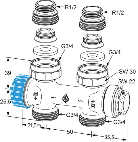 das Multilux Thermostat-Ventilunterteil wird für den Anschluss an Heizkörper mit unterem Zweipunktanschluss wie z.B. Badheizkörper, Universalheizkörper etc. verwendet, für Heizkörper mit unterem Zweipunktanschluss, Mittenabstand der Anschlüsse 50 mm, Gehäuse aus korrosionsbeständigem, entzinkungsfreiem Rotguss, vernickelt, mit Niro-Stahlspindel und doppelter O-Ring-Abdichtung, äußerer O-Ring ist unter Druck auswechselbar, das komplette Thermostat-Oberteil kann mit einem Montagegerät ohne Entleeren der Anlage ausgewechselt werden, Vor- und Rücklauf absperrbar, separater Regulierkegel für reproduzierbare Voreinstellung, Anschluss für Entleerungs- und Fülleinrichtung, Vor- und Rücklaufanschluss sind beliebig wählbar, Anschluss Außengewinde G 3/4, in Verbindung mit Klemmverschraubungen für Kunststoff-, Kupfer-, Präzisionsstahl- oder Verbundrohr, max. Betriebstemperatur 120 °C, mit Verkleidung 90 °C, min. Betriebstemperatur -10 °C, zulässiger Betriebsüberdruck PB 10 bar, Anschlussstücke für Heizkörperanschlüsse R 1/2 der G 3/4, Toleranzausgleich +/-1 mm durch spezielle Überwurfmuttern und flexibles Flachdichtungs-System für spannungsfreie Montage, Anschluss für Thermostat-Köpfe und Stellantriebe M 30 x 1,5, Zweirohrsystem Bauschutzkappe blau und zwei waagerechte Pfeile auf dem Ventilgehäuse, DN 15, Nenndruck PN 10