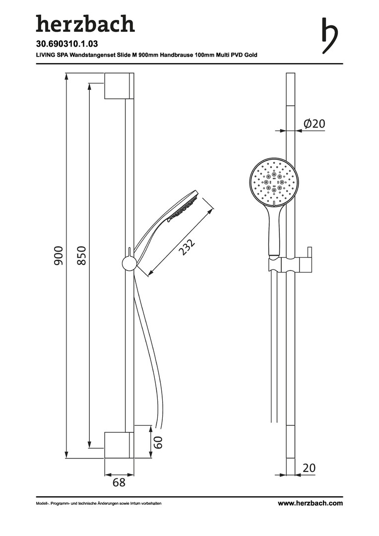 Herzbach Brausegarnitur Living Spa Slide M 900mm, Handbrause 100mm Multifunktion, Brauseschlauch, PVD-gold