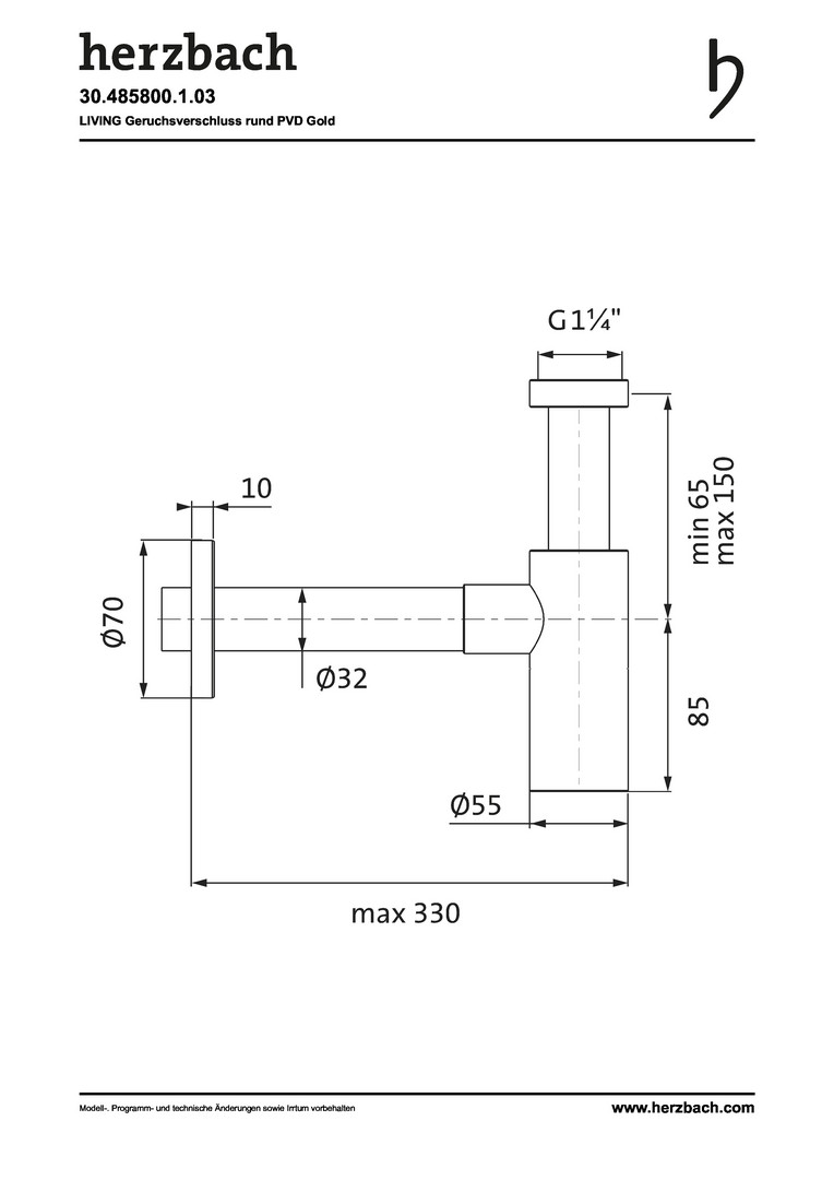Herzbach Design-Geruchsverschluss Living 1 1/4", mit Reinigungsöffnung, PVD-gold