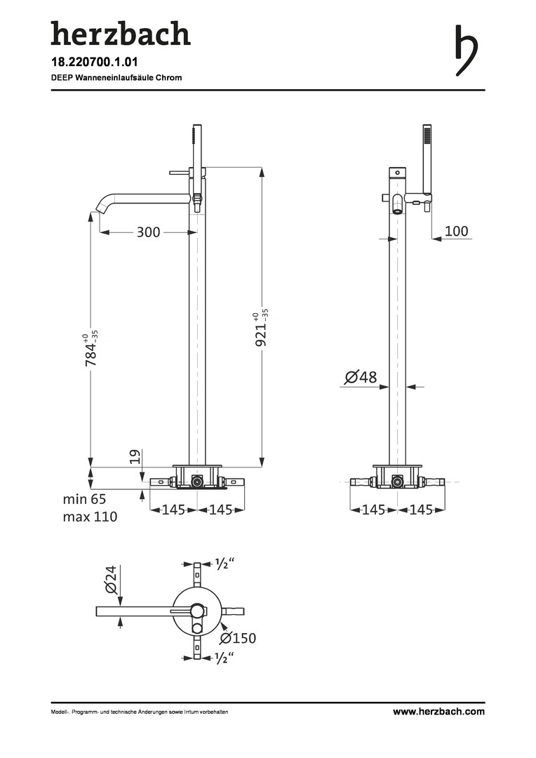 Herzbach Fertigmontageset Deep Wanneneinlaufsäule, bodenstehend, mit Brausegarnitur, chrom