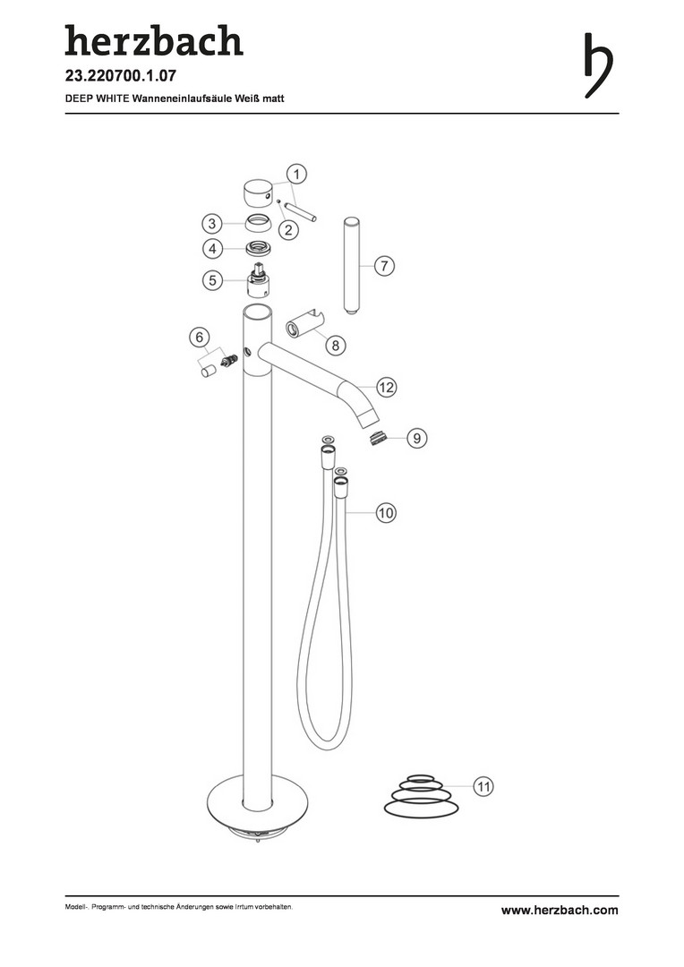 Herzbach Fertigmontageset Deep Wanneneinlaufsäule, bodenstehend, mit Brausegarnitur, weiß matt
