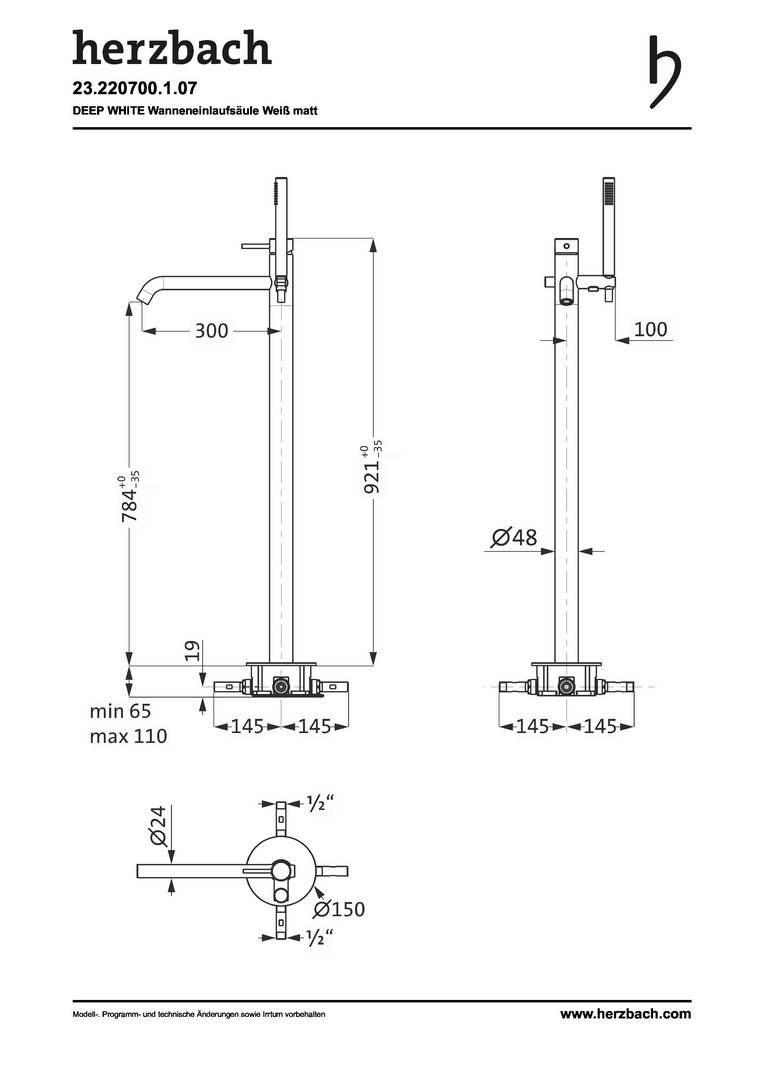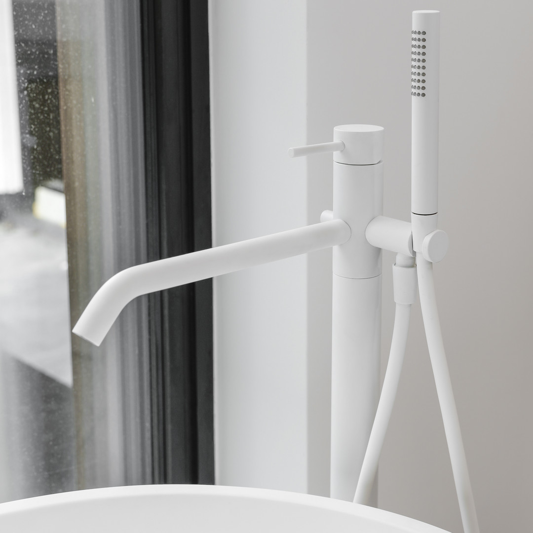 Herzbach Fertigmontageset Deep Wanneneinlaufsäule, bodenstehend, mit Brausegarnitur, weiß matt 251723