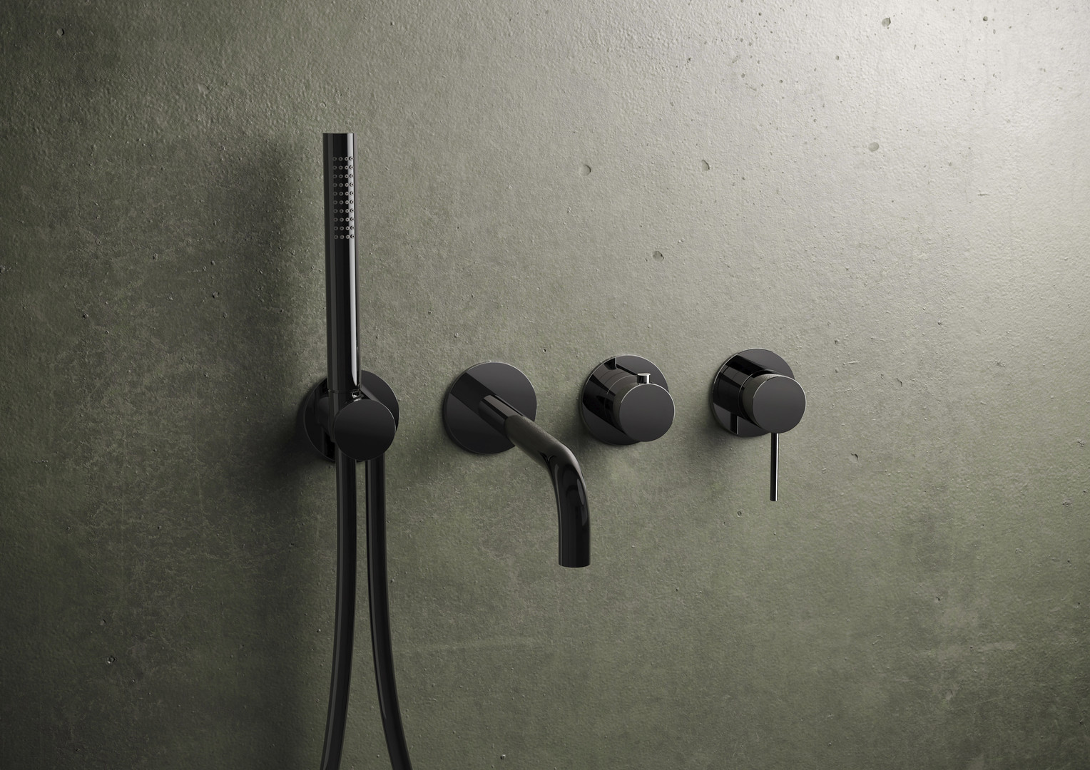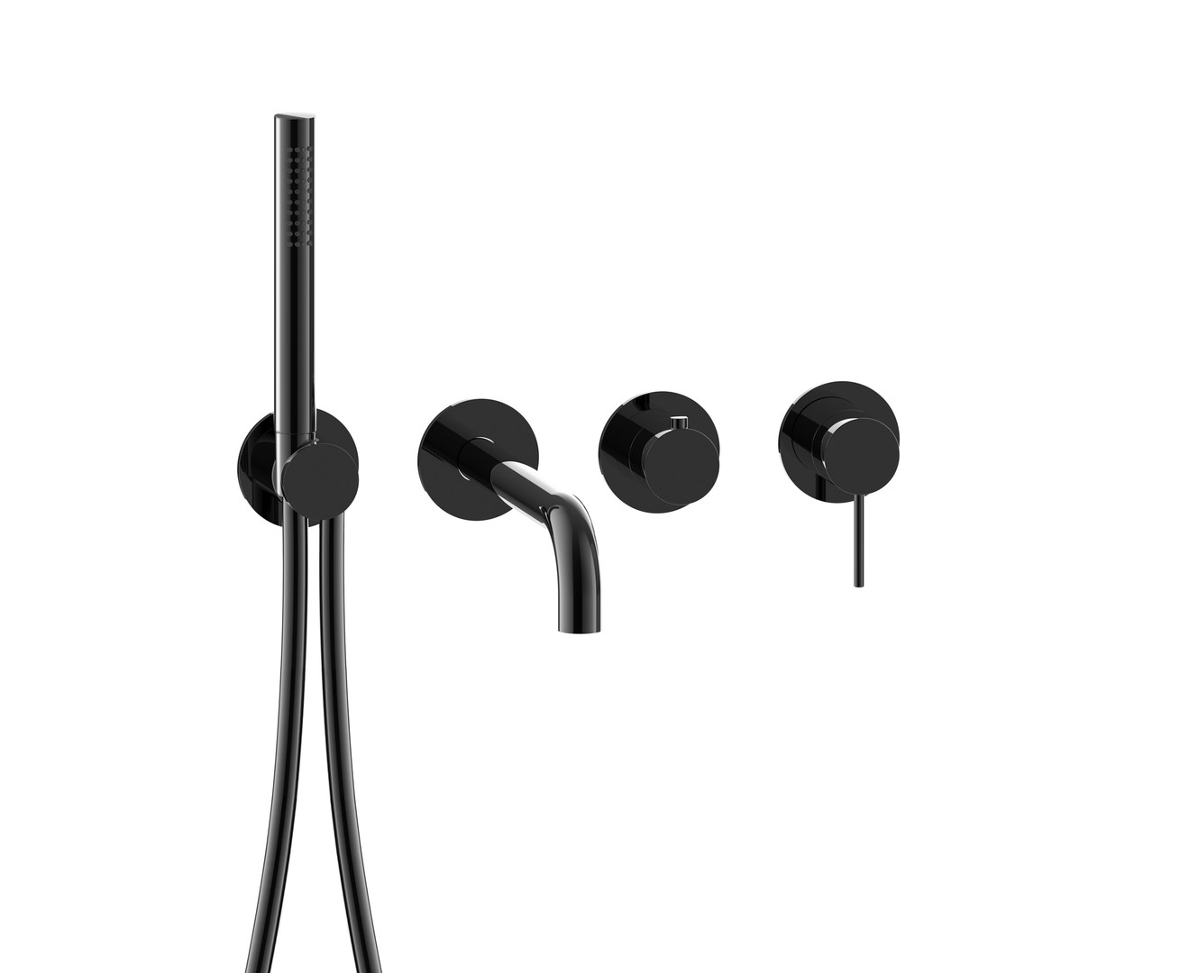 Herzbach Fertigmontageset MODUL7 Brause-Einhebelmischer, mit Wandauslauf und Stabhandbrause, 2 Verbraucher, PVD absolut black