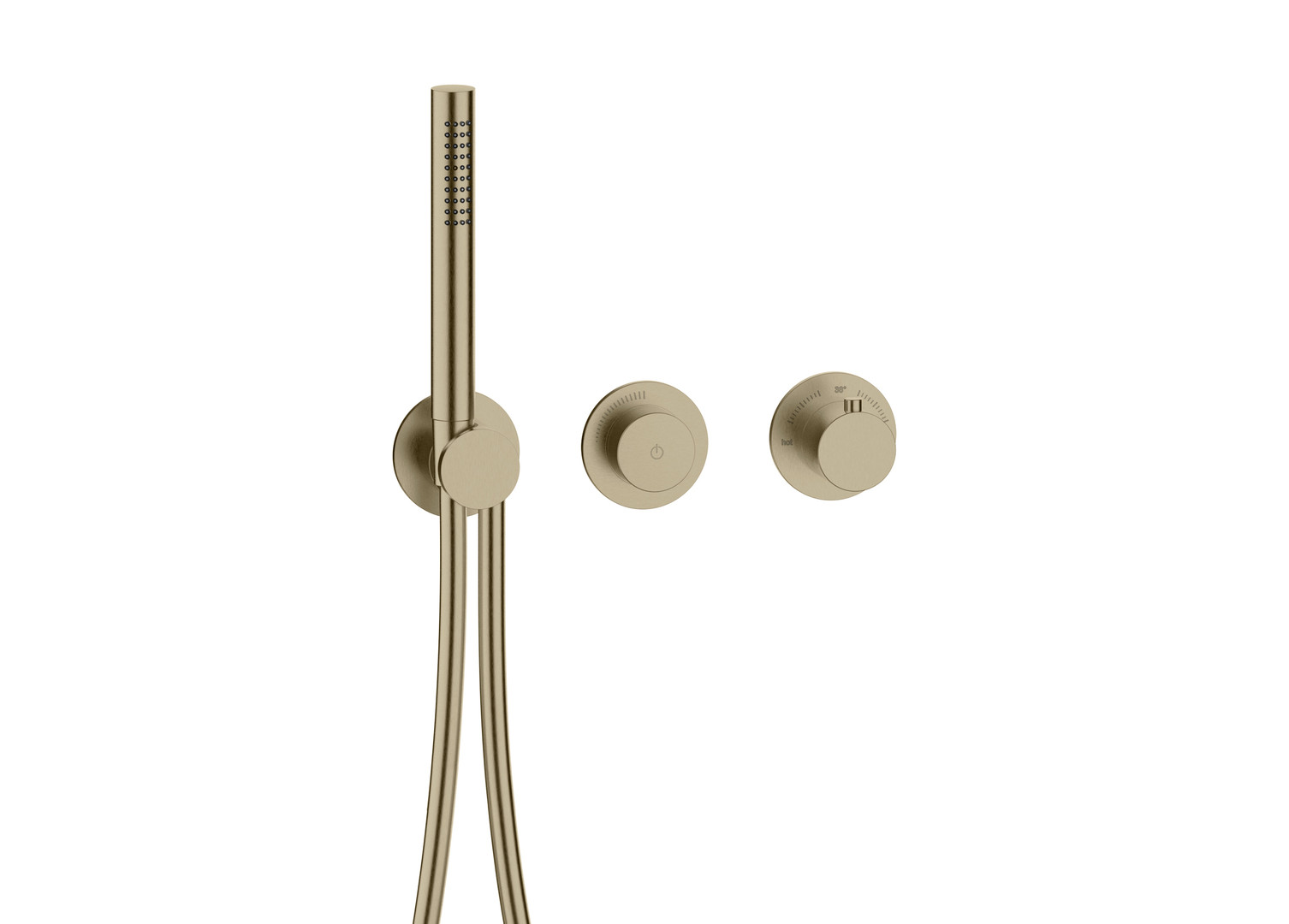 LOGIC-Thermostatkartusche, Heißwassersperre 38°C, Start + Stop des Wasserflusses durch drücken des PUSH Mengenventils, stufenlose Mengenregulierung, MODUL7 Brauseschlauch 150 cm mit Drehkonus, eigensicher gegen Rückfließen, bestehend aus Thermostat, PUSH Mengenventil, Brausehalterset, Ausführung chrom/PVD Gold/schwarz matt mit Messing Stabhandbrause, Messing Bediengriffen und Messing Modulblenden Ø 70 mm, Ausführung Edelstahl mit Edelstahl Stabhandbrause, Edelstahl Bediengriffen und Edelstahl Modulblenden Ø 70 mm