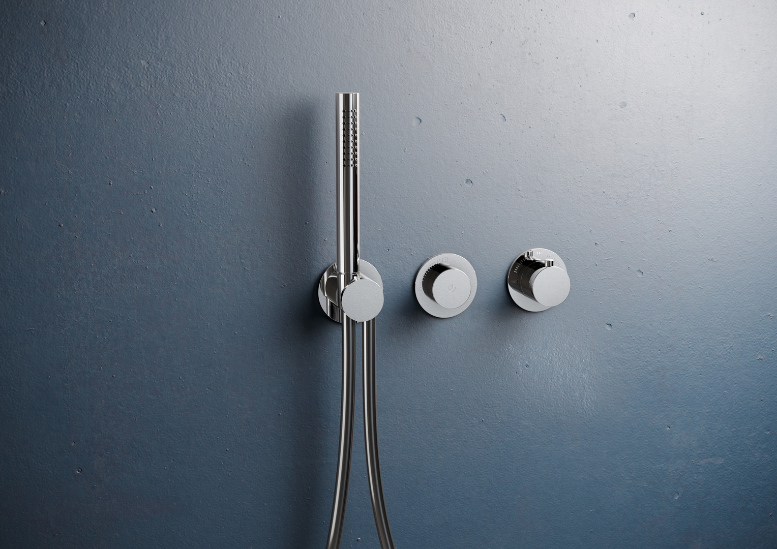 LOGIC-Thermostatkartusche, Heißwassersperre 38°C, Start + Stop des Wasserflusses durch drücken des PUSH Mengenventils, stufenlose Mengenregulierung, MODUL7 Brauseschlauch 150 cm mit Drehkonus, eigensicher gegen Rückfließen, bestehend aus Thermostat, PUSH Mengenventil, Brausehalterset, Ausführung chrom/PVD Gold/schwarz matt mit Messing Stabhandbrause, Messing Bediengriffen und Messing Modulblenden Ø 70 mm, Ausführung Edelstahl mit Edelstahl Stabhandbrause, Edelstahl Bediengriffen und Edelstahl Modulblenden Ø 70 mm