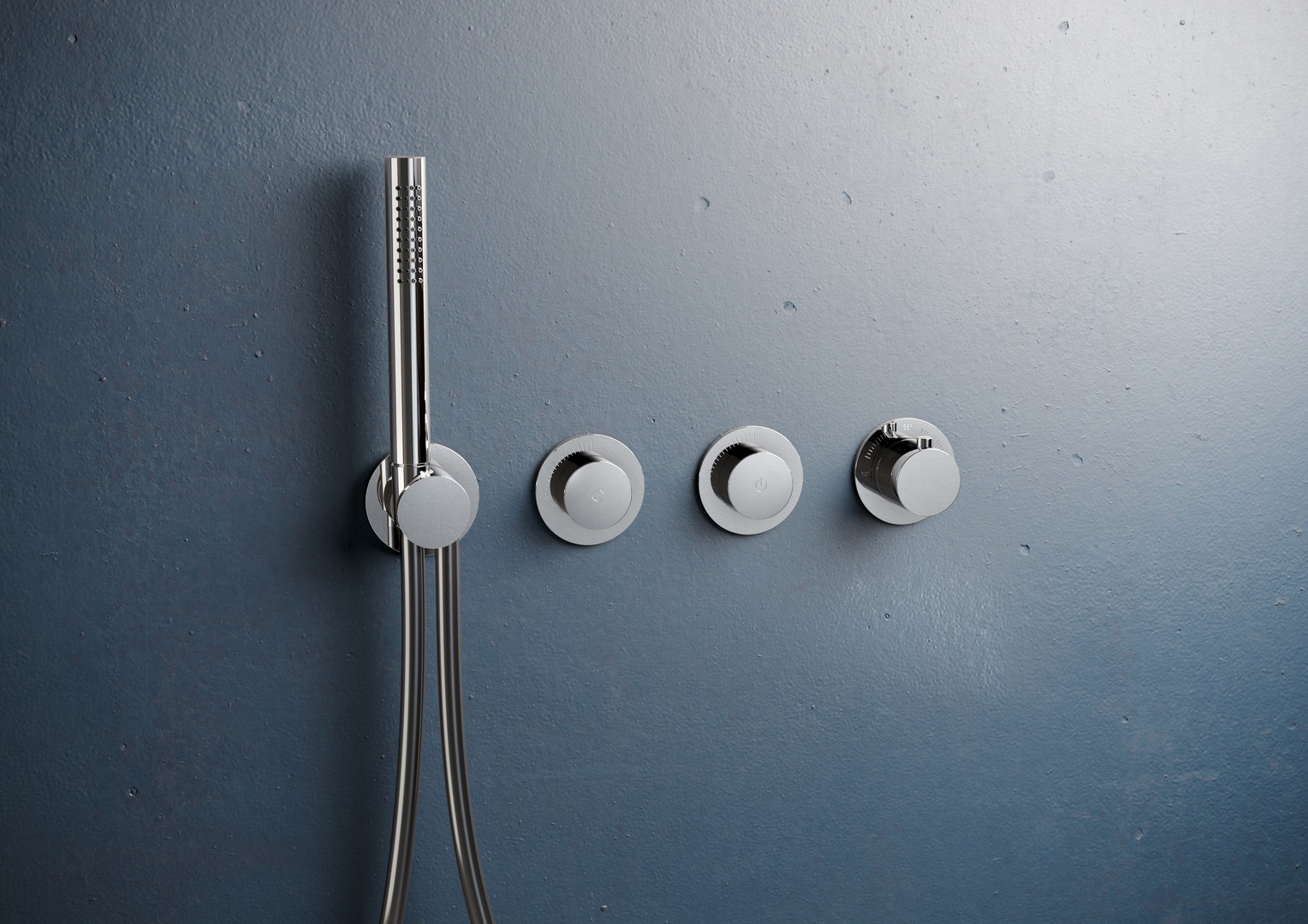 LOGIC-Thermostatkartusche, Heißwassersperre 38°C, Start + Stop des Wasserflusses durch drücken des PUSH Mengenventils, stufenlose Mengenregulierung, MODUL7 Brauseschlauch 150 cm mit Drehkonus, eigensicher gegen Rückfließen, bestehend aus Thermostat, 2x PUSH Mengenventil, Brausehalterset, Ausführung chrom/PVD Gold/schwarz matt mit Messing Stabhandbrause, Messing Bediengriffen und Messing Modulblenden Ø 70 mm, Ausführung Edelstahl mit Edelstahl Stabhandbrause, Edelstahl Bediengriffen und Edelstahl Modulblenden Ø 70 mm