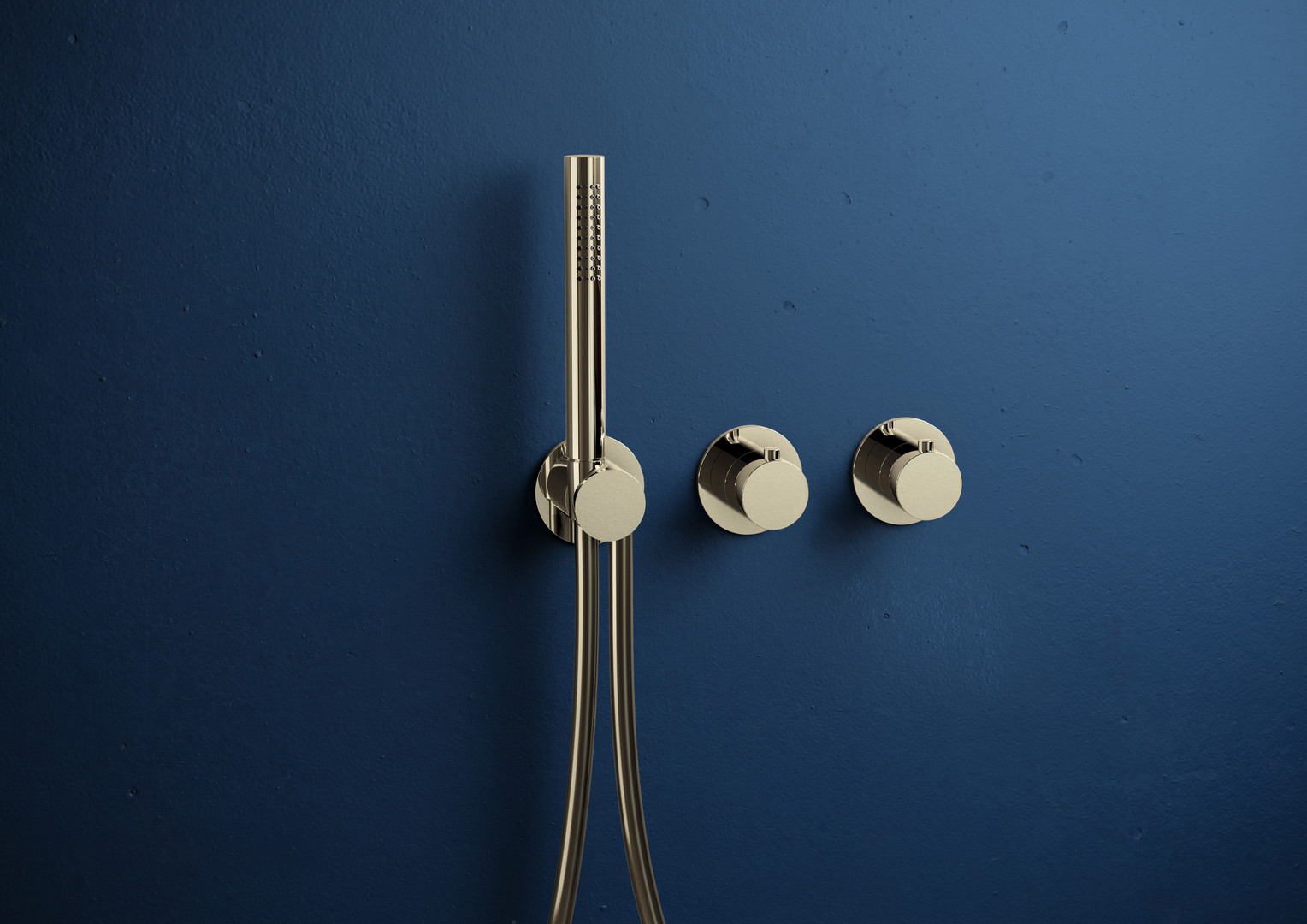 LOGIC-Thermostatkartusche, keramischer 2/3 Wege-Umsteller, Heißwassersperre 38°C, stufenlose Mengenregulierung, MODUL7 Brauseschlauch 150 cm mit Drehkonus, eigensicher gegen Rückfließen, bestehend aus Thermostat, Ab- und Umstellventil, Brausehalterset, Ausführung chrom/PVD Gold/schwarz matt mit Messing Stabhandbrause, Messing Bediengriffen und Messing Modulblenden Ø 70 mm, Ausführung Edelstahl und Edelstahl PVD mit Edelstahl Stabhandbrause, Edelstahl Bediengriffen und Edelstahl Modulblenden Ø 70 mm