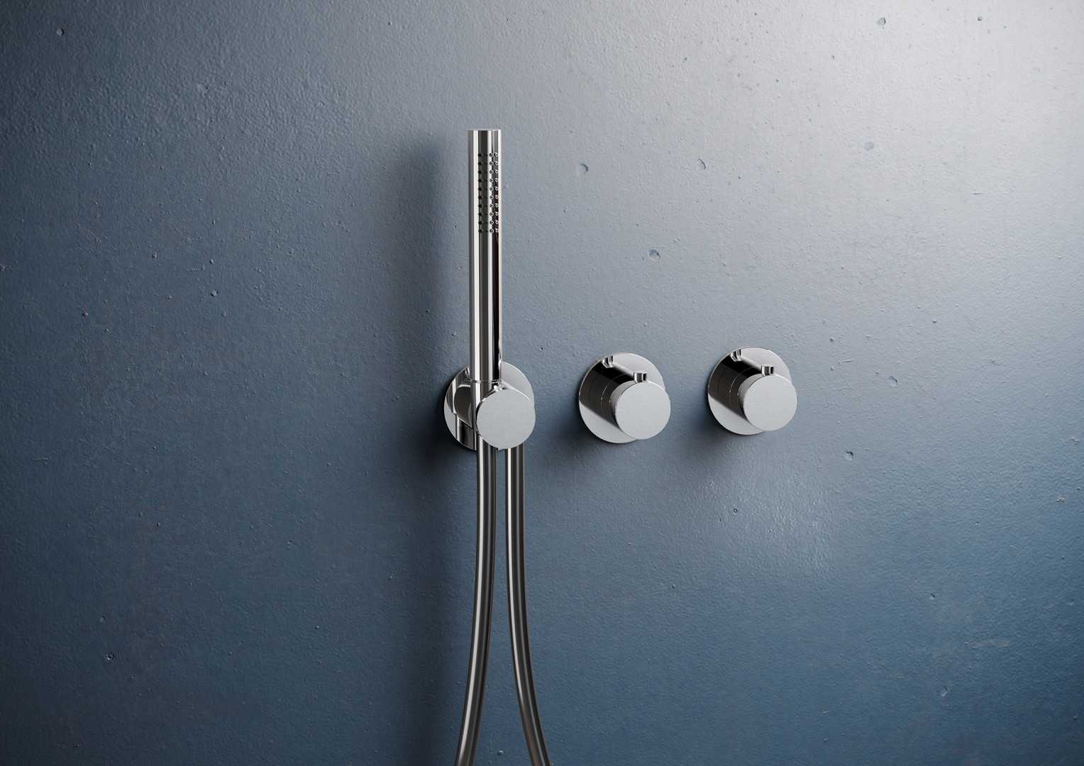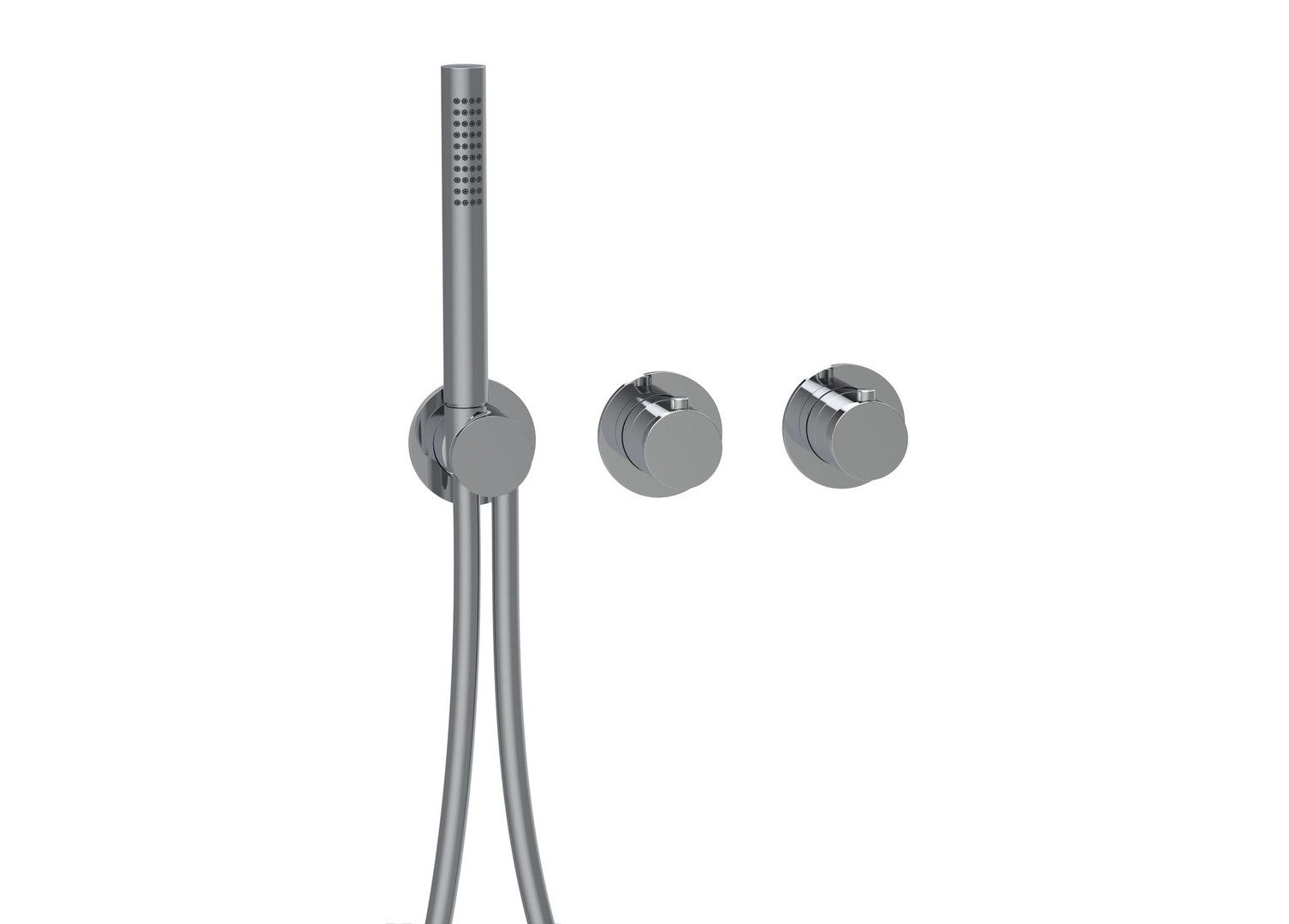 LOGIC-Thermostatkartusche, keramischer 2/3 Wege-Umsteller, Heißwassersperre 38°C, stufenlose Mengenregulierung, MODUL7 Brauseschlauch 150 cm mit Drehkonus, eigensicher gegen Rückfließen, bestehend aus Thermostat, Ab- und Umstellventil, Brausehalterset, Ausführung chrom/PVD Gold/schwarz matt mit Messing Stabhandbrause, Messing Bediengriffen und Messing Modulblenden Ø 70 mm, Ausführung Edelstahl und Edelstahl PVD mit Edelstahl Stabhandbrause, Edelstahl Bediengriffen und Edelstahl Modulblenden Ø 70 mm