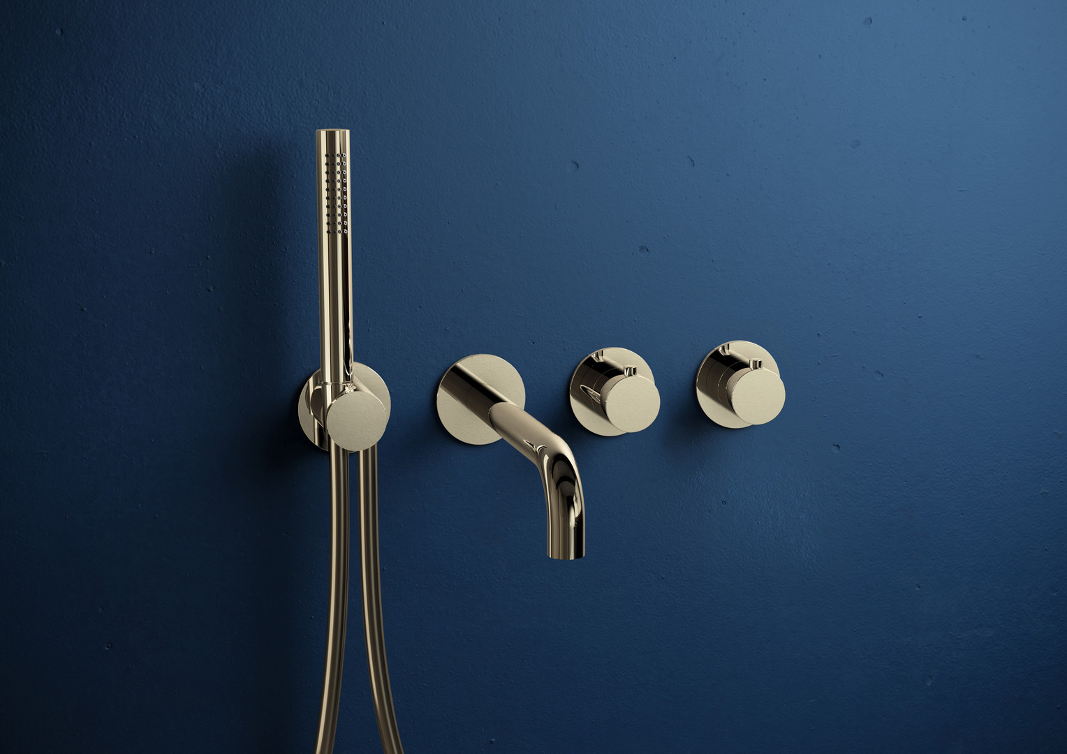 Herzbach Fertigmontageset MODUL7 Thermostat, mit Wandauslauf und Stabhandbrause, 2 Verbraucher, PVD Gold