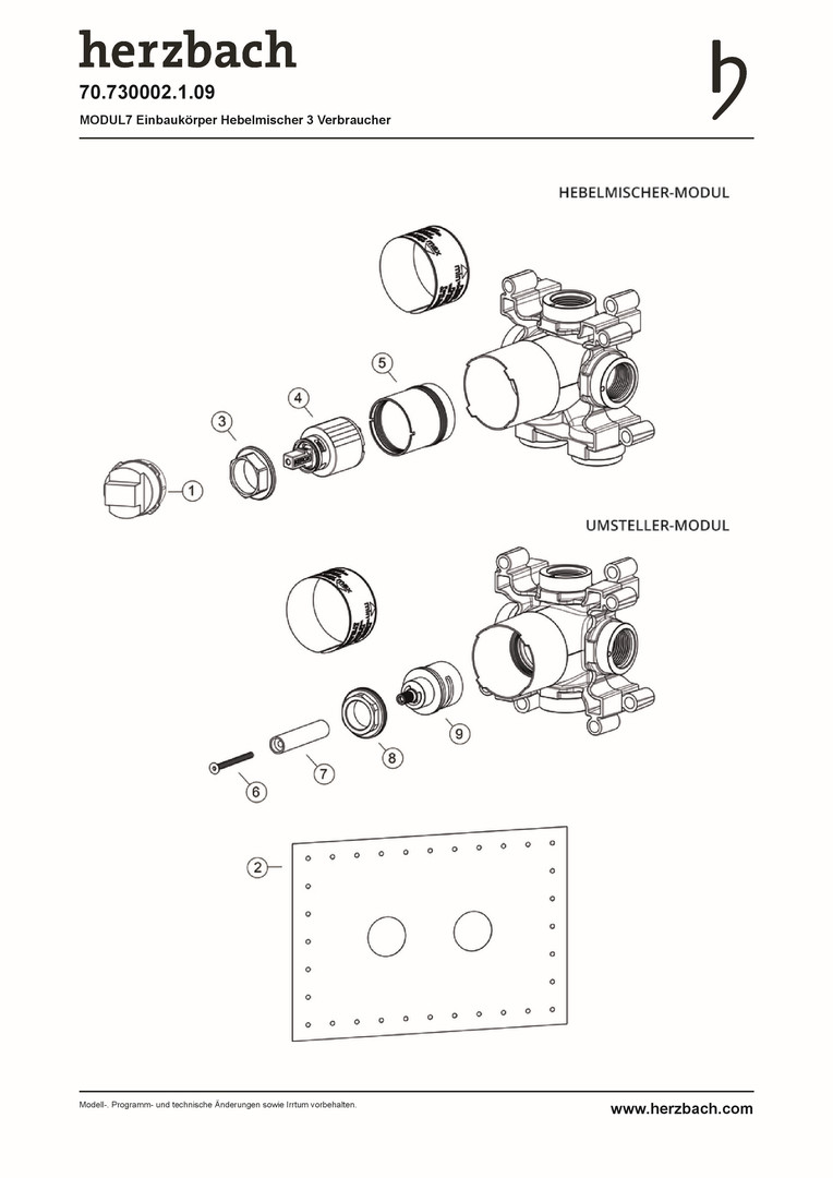 Herzbach Hebelmischer-Einbaukörper MODUL7 Einbautiefe 6cm - 9cm, für 3 Verbraucher, 3 Wege-Umsteller