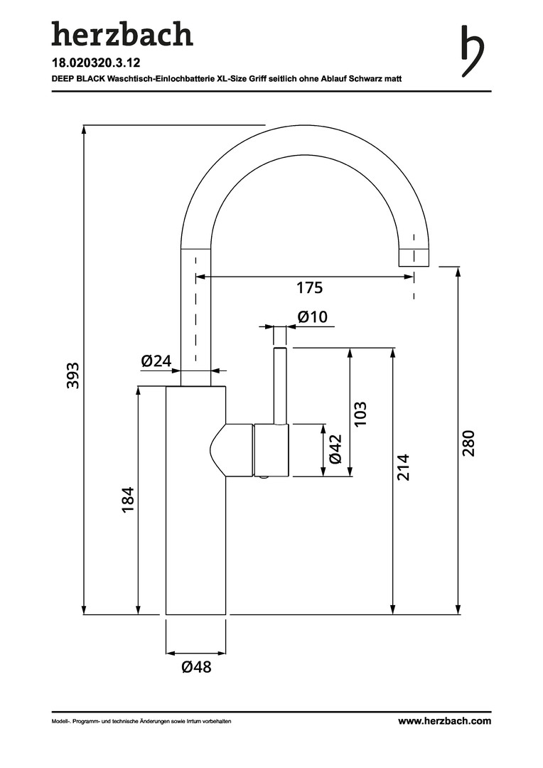 Herzbach Waschtisch-Einhebelmischer Deep L-Size, ohne Ablaufgarnitur, Schwarz matt