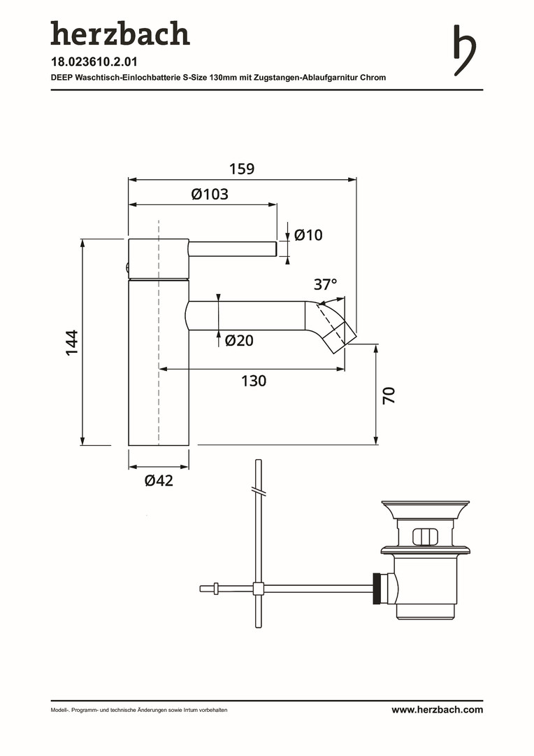 Herzbach Waschtisch-Einhebelmischer Deep S-Size, chrom, 130 mm, Zugstangen-Ablaufgarnitur W334666