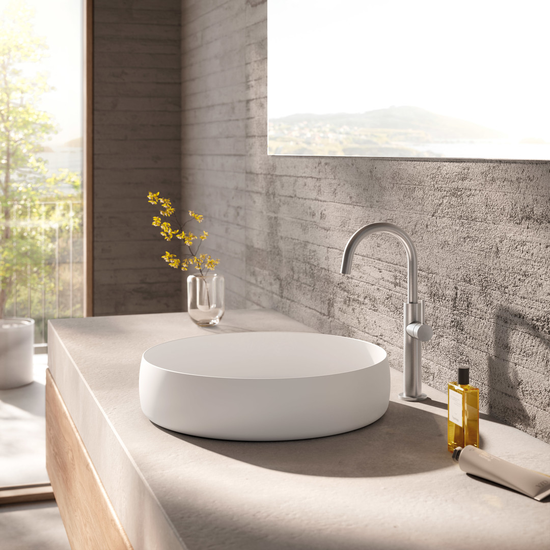 mit erhöhtem Schaft, Auslauf schwenkbar 360°, LOGIC-SoftEmotion-Keramikkartusche, Neoperl-Sparperlator, LOGIC-Fix-Schnellbefestigung, Anschlussschläuche, DVGW zertifiziert, mit separatem PUSH-Ablaufventil
