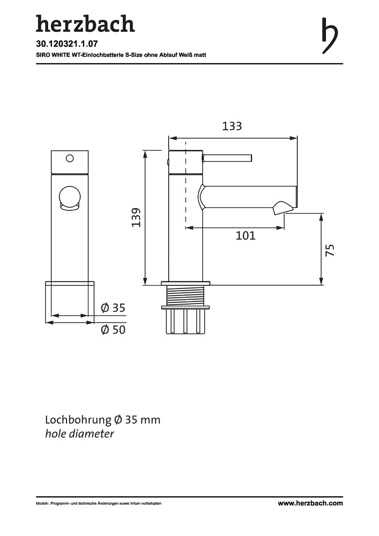 Herzbach Waschtisch-Einhebelmischer Siro S-Size ohne Ablaufgarnitur, weiß matt W335347